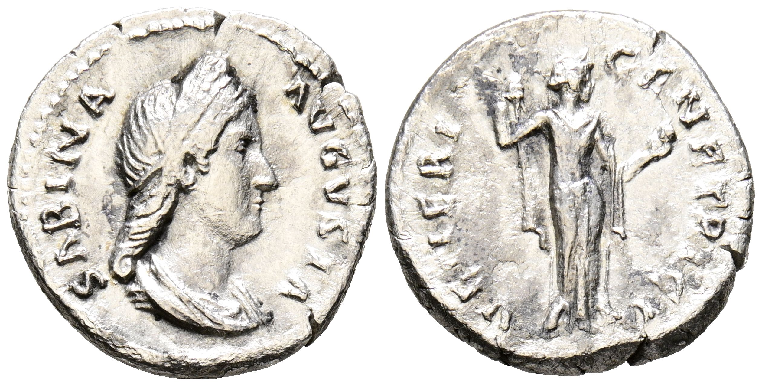 SABINA. Denario. (Ar. 3,06/17mm). 136-138 d.C. Roma. (RIC 396). Anv: Busto diademado y drapeado de Sabina a derecha, alrededor leyenda: SABINA AVGVSTA. Rev: Venus estante a derecha con una manzana y sujetándose el vestido, alrededor leyenda: VENERI GENETRICI. MBC.