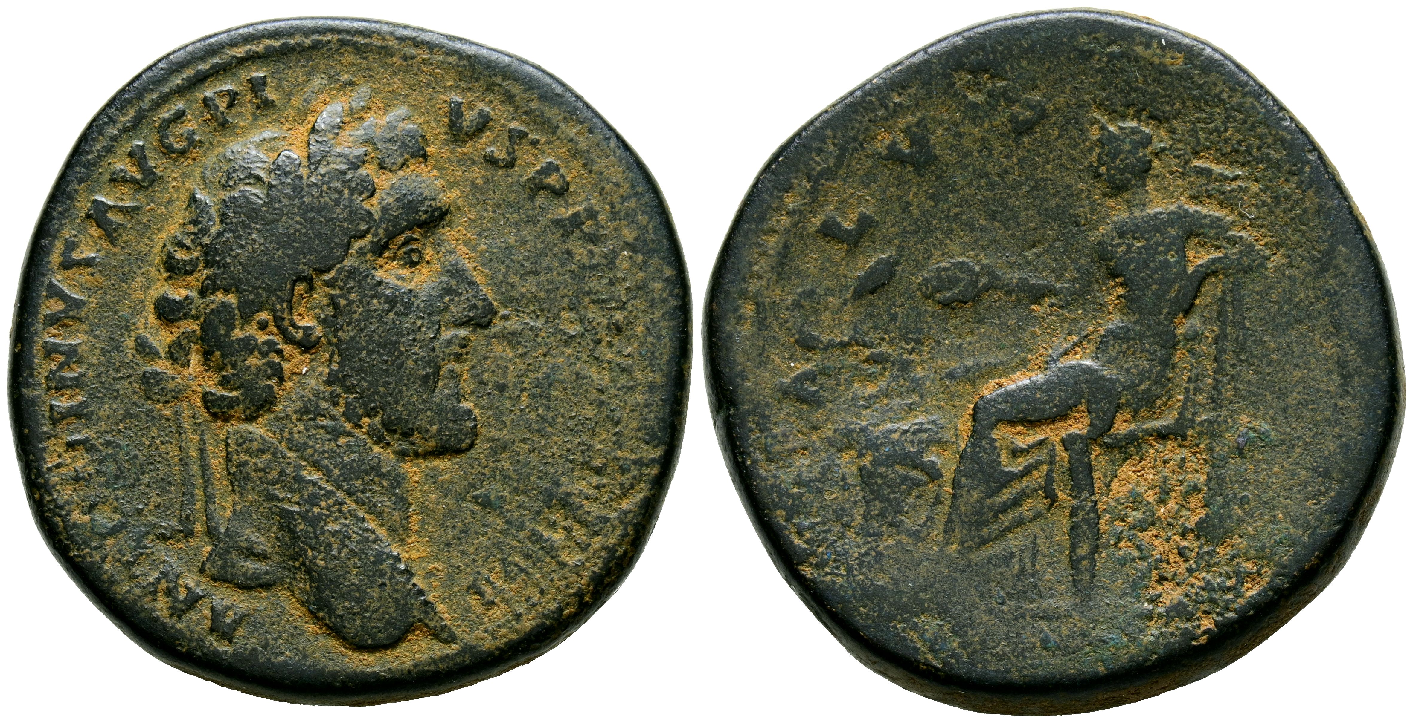 ANTONINO PIO. Sestercio. (Ae. 26,91g/34mm). 141-143 d.C. Roma. (RIC 638). Anv: Cabeza laureada de Antonino Pío a derecha, alrededor leyenda: ANTONINVS AVG PIVS P P TR P COS IIII. Rev: Salus sentada a izquierda con patera sobre altar con serpiente, en exergo: SC, alrededor leyenda: SALVS PVBLICA. MBC-. Repasada.