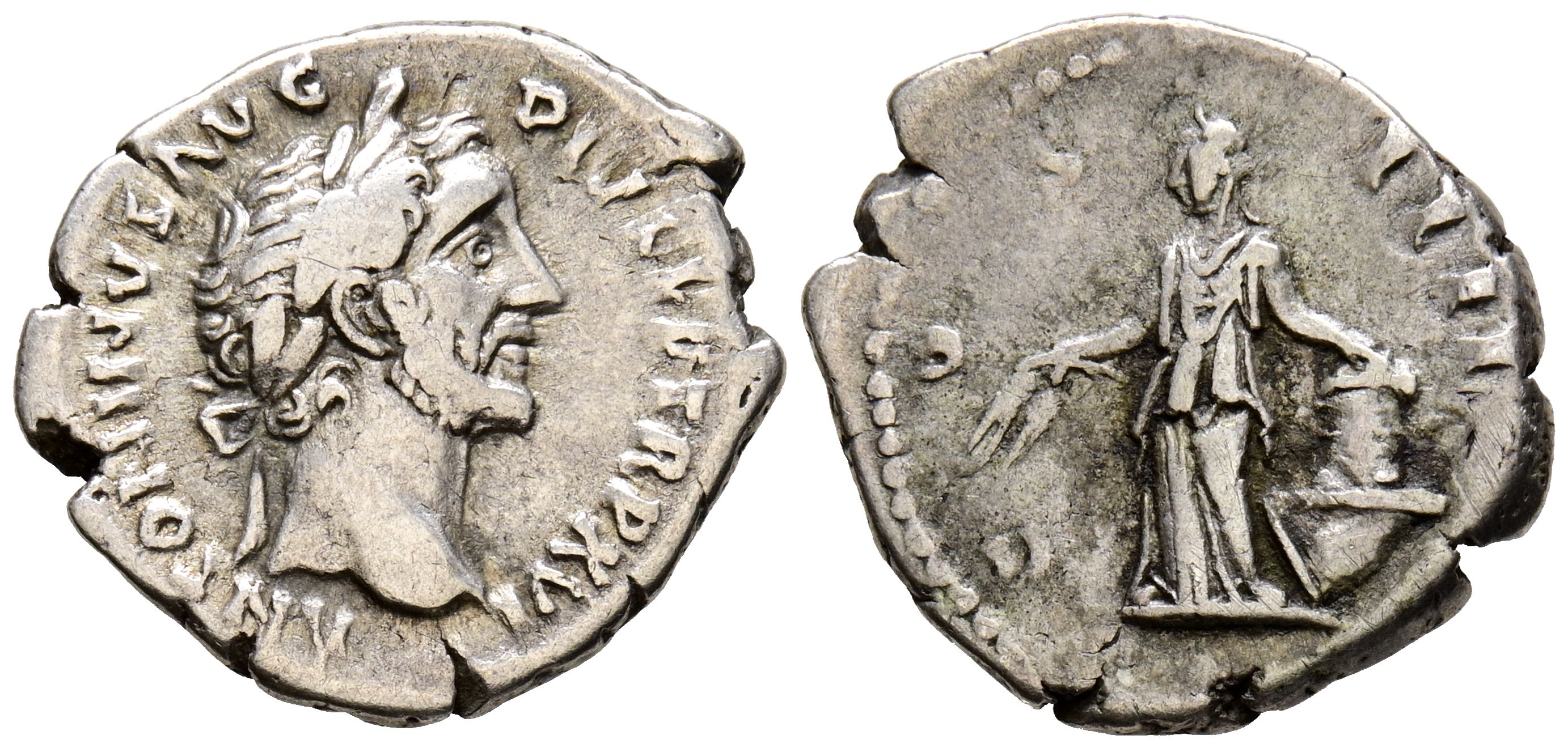 ANTONINO PIO. Denario. (Ar. 3,22g/19mm). 152-153 d.C. Roma. (RIC 221). Anv: Cabeza laureada de Antonino Pío a derecha, alrededor leyenda: ANTONINVS AVG PIVS P P TR P XVI. Rev: Annona estante a izquierda portando granos y apoyada en modio sobre proa, alrededor leyenda: COS IIII. MBC.