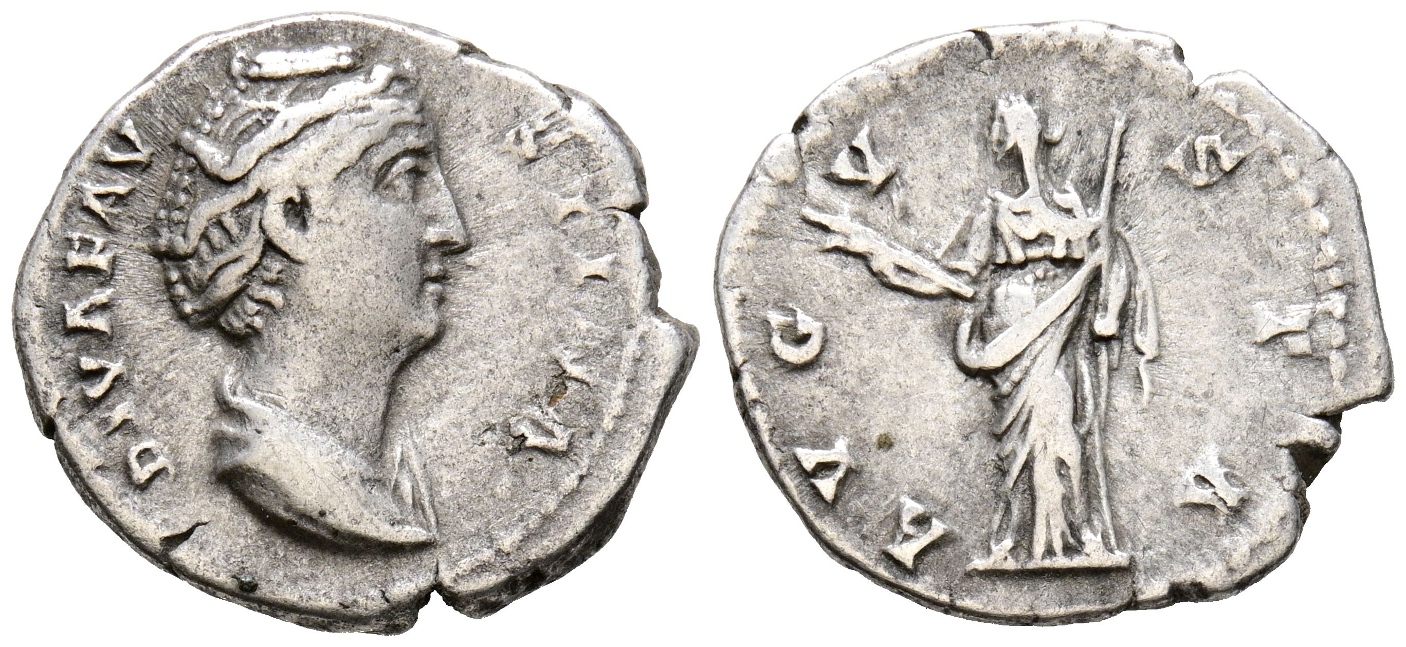 FAUSTINA I. Denario. (Ar. 3,35g/19mm). 141 d.C. Roma. (RIC 356). Anv: Busto diademado y drapeado de Faustina I a derecha, alrededor leyenda: DIVA FAVSTINA. Rev: Ceres estante a izquierda portando antorcha y cetro, alrededor leyenda: AVGVSTA. MBC.