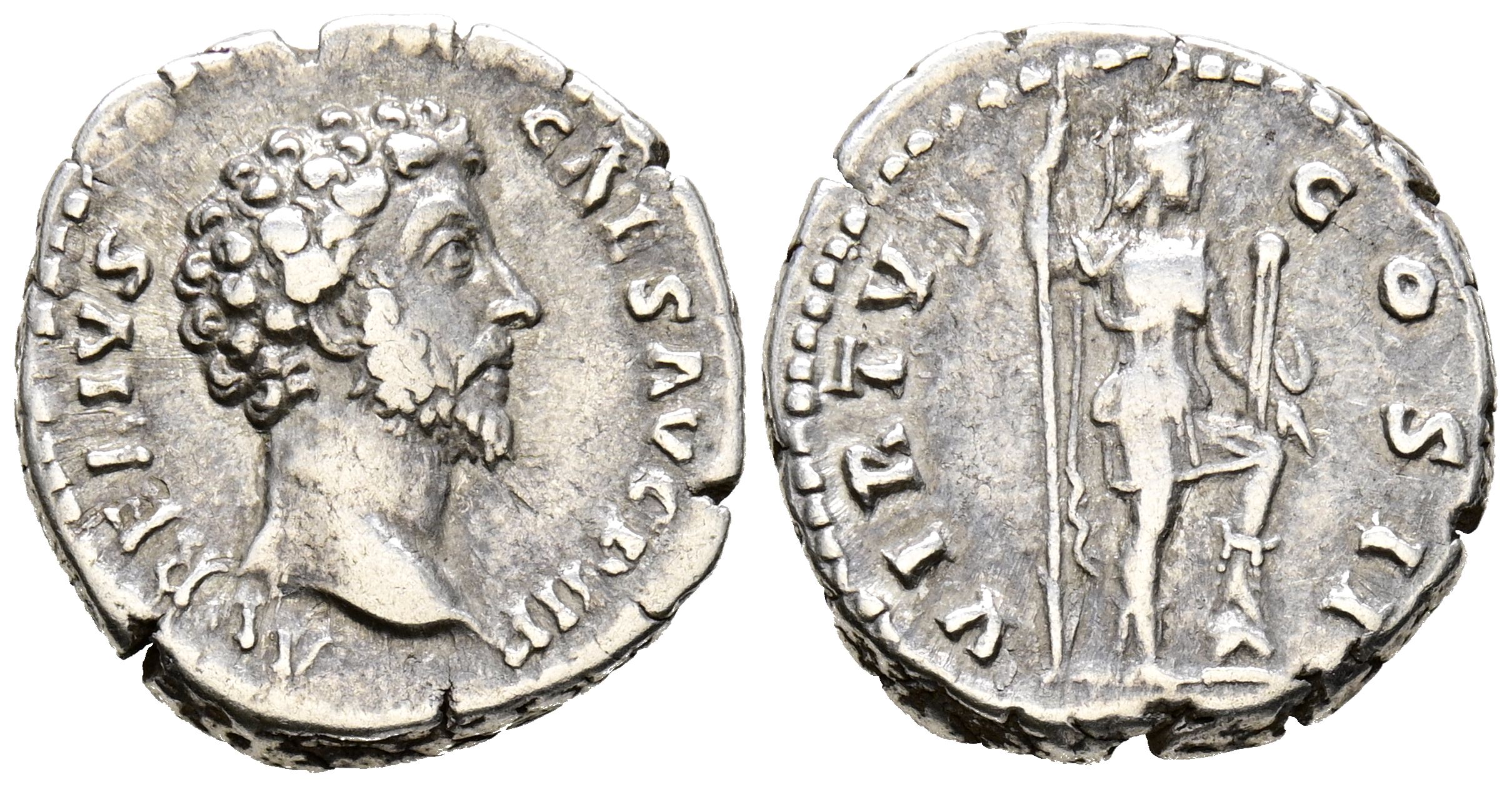 MARCO AURELIO. Denario. (Ar. 3,42g/18mm). 145-146 d.C. Roma. (RIC 433). Anv: Cabeza de Marco Aurelio a derecha, alrededor leyenda: AVRELIVS CAES AVG PII F. Rev: Rev: Virtus estante a derecha portando parazonium y lanza con pie sobre casco, alrededor leyenda: VIRTVS COS II. MBC.