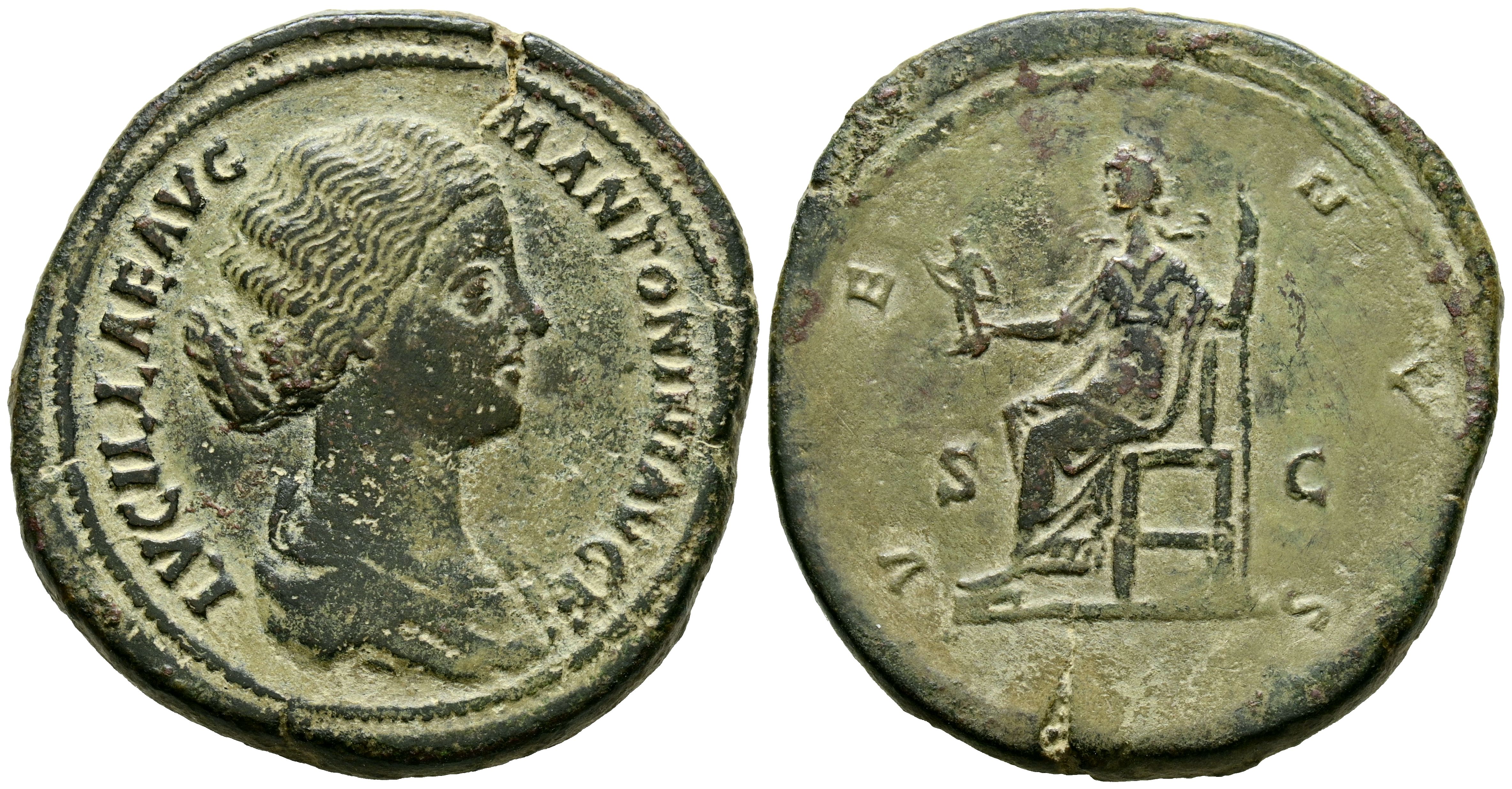LUCILLA. Sestercio. (Ae. 27,60g/35mm). 161-162 d.C. Roma. (RIC 1756). Anv: Busto drapeado y diademado de Lucilla a derecha, alrededor leyenda: LVCILLAE AVG ANTONINI AVG F. Rev: Vesta estante a izquierda portando acerrum y tirando incienso sobre altar, entre S-C, alrededor leyenda: PIETAS. MBC+. Retocada.