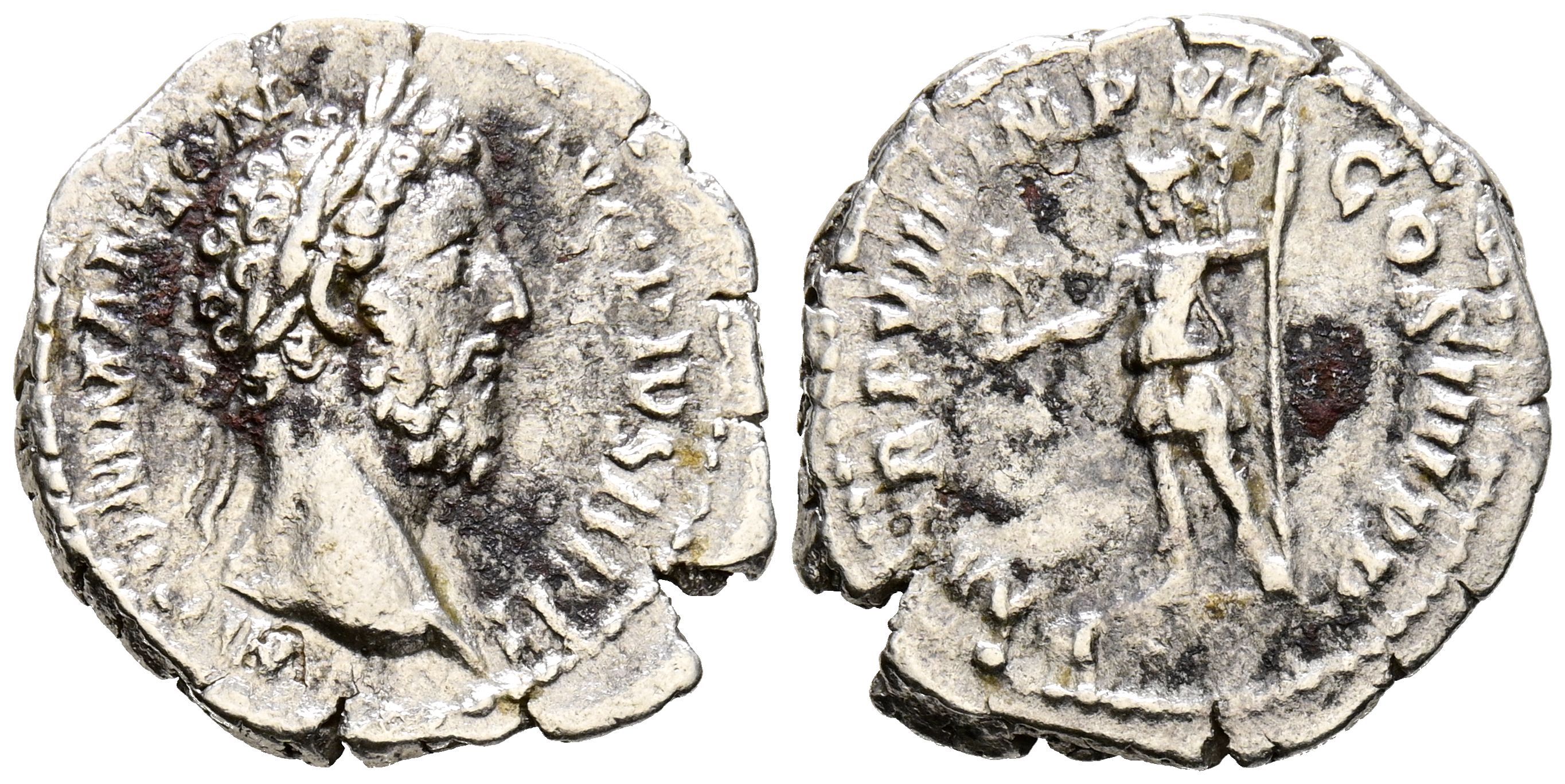 COMODO. Denario. (Ar. 3,69g/19mm). 184 a.C. Roma. (RIC 90). Anv: Busto laureado de Comodo a derecha, alrededor leyenda: COMM ANT AVG P BRIT. Rev: Roma estante a izquierda con Victoria sobre globo y lanza, alrededor leyenda: P M TR P VIIII IMP VI COS IIII P P. MBC- . Limpiada.