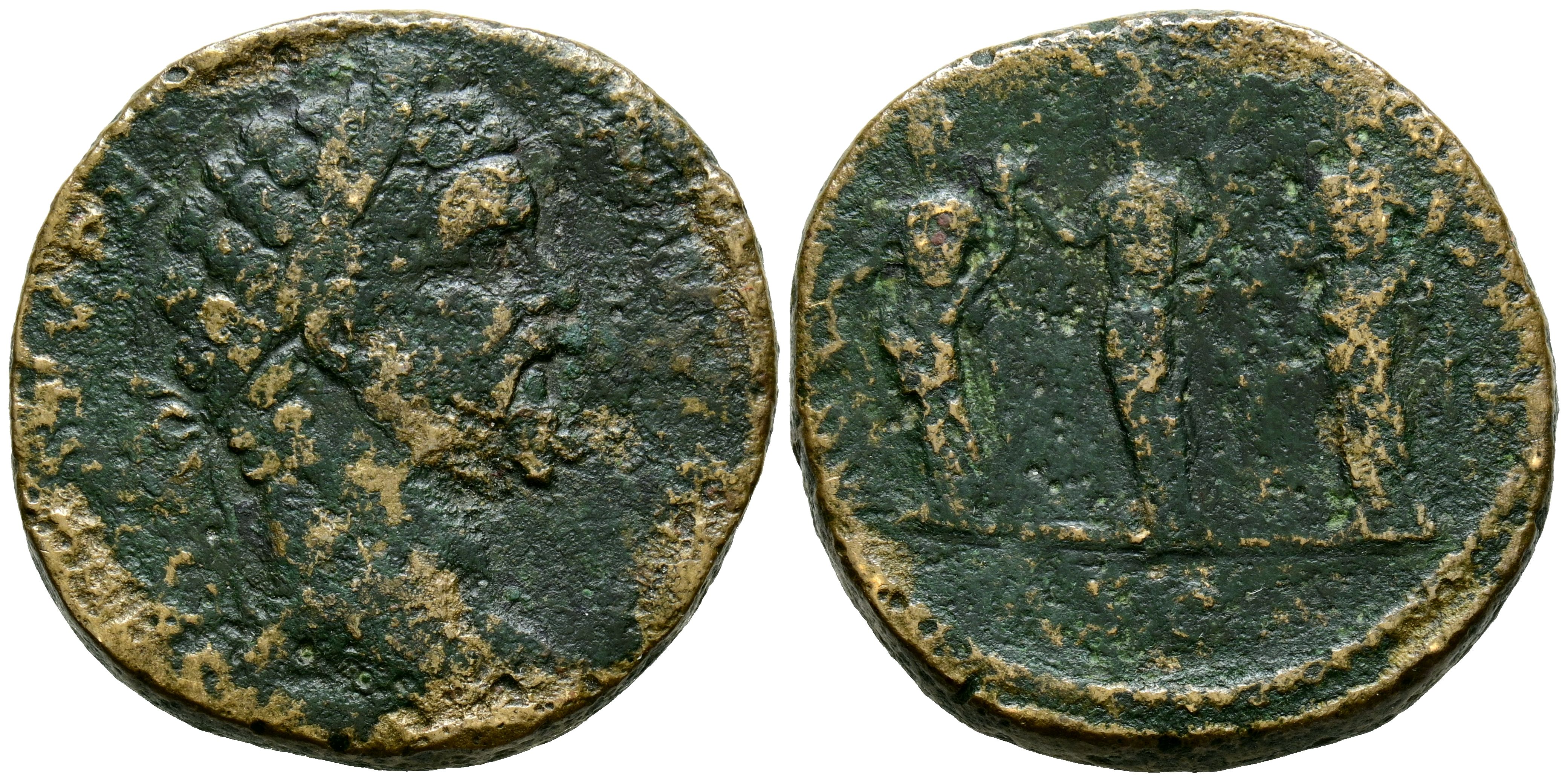 SEPTIMIO SEVERO. Sestercio. (Ae. 12,62g/29mm). 194 d.C. Roma. (RIC 670). Anv: Cabeza laureada de Septimio Severo a derecha, alrededor leyenda: L SEPT SEV PERT AVG IMP III. Rev: Las tres Monetas estantes mirando a izquierda portando escalas y cornucopias, en exergo: SC, alrededor leyenda: MONET AVG COS II P P. BC+. Limpiado. Raro ejemplar.
