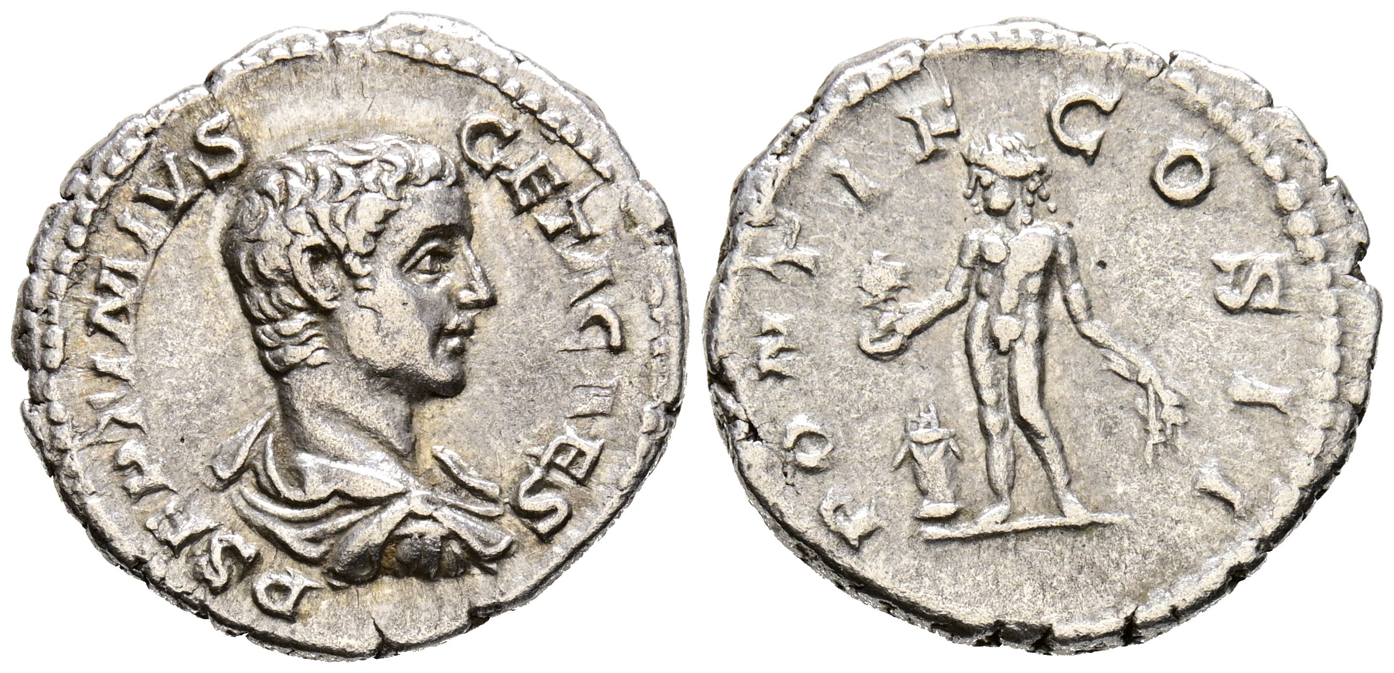 GETA. Denario. (Ar. 3,36g/20mm). 208-209 d.C. Roma. (RIC 59a). Anv: Busto drapeado de Geta a derecha, alrededor leyenda: P SEPTIMIVS GETA CAES. Rev: Genio estante a izquierda con patera sobre altar y espiga, alrededor leyenda: PONTIF COS II. MBC+.