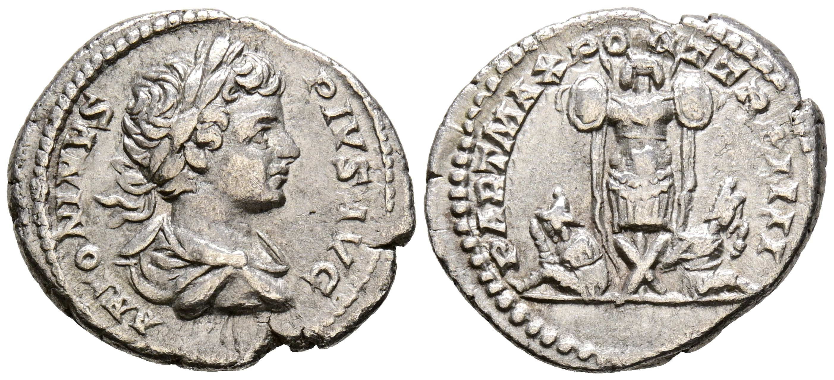 CARACALLA. Denario. (Ar. 3,10g/19mm). 201 d.C. Roma. (RIC 54b). Anv: Busto laureado, drapeado y con coraza de Caracalla a derecha, alrededor leyenda: ANTONINVS PIVS AVG. Rev: Trofeo entre dos cautivos sentados, alrededor leyenda: PART MAX PONT TR P IIII. MBC+.