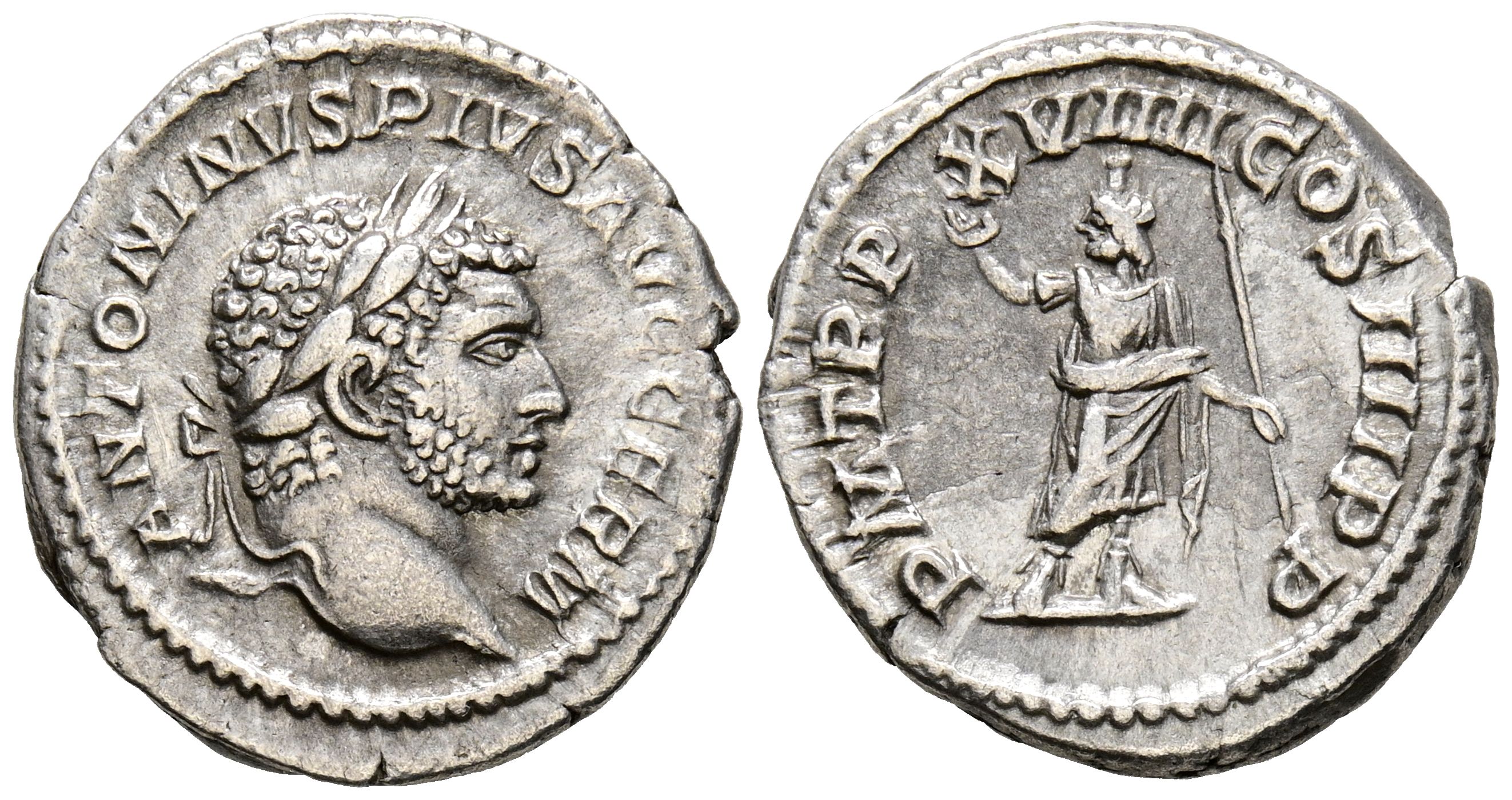 CARACALLA. Denario. (Ar. 3,14g/22mm). 216 d.C. Roma. (RIC 280). Anv: Busto laureado de Caracalla a derecha, alrededor leyenda: ANTONINVS PIVS AVG GERM. Rev: Serapis estante a izquierda portando cetro y alzando mano derecha, alrededor leyenda: P M TR P XVIIII COS IIII P P. MBC.