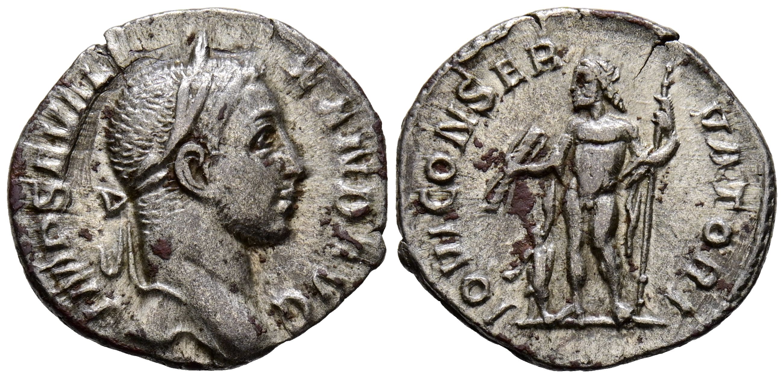 ALEJANDRO SEVERO. Denario. (Ar. 2,18g/18mm). 228-231 d.C. Roma. (RIC 200). Anv: Cabeza laureada de Alejandro Severo a derecha, alrededor leyenda: IMP SEV ALEXAND AVG. Rev: Júpiter estante a izquierda portando cetro y haz de rayos, a sus pies, figura pequeña de Alejandro Severo, alrededor leyenda: IOVI CONSERVATORI. MBC.