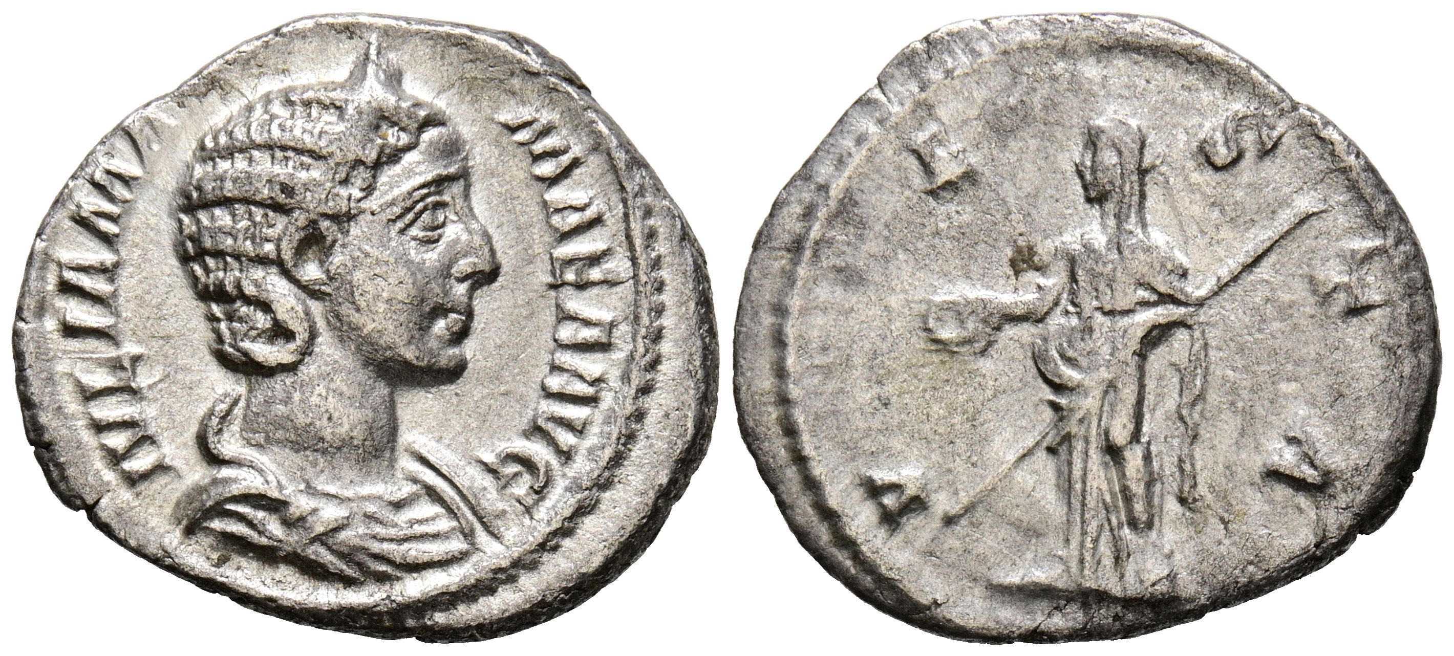 JULIA MAMAEA. Denario. (Ar. 2,53g/20mm). 226 d.C. Roma. (RIC 360). Anv: Busto diademado y drapeado de Julia Mamaea a derecha, alrededor leyenda: IVLIA MAMAEA AVG. Rev: Vesta estante a izquierda portando palladium y cetro, alrededor leyenda: VESTA. MBC.