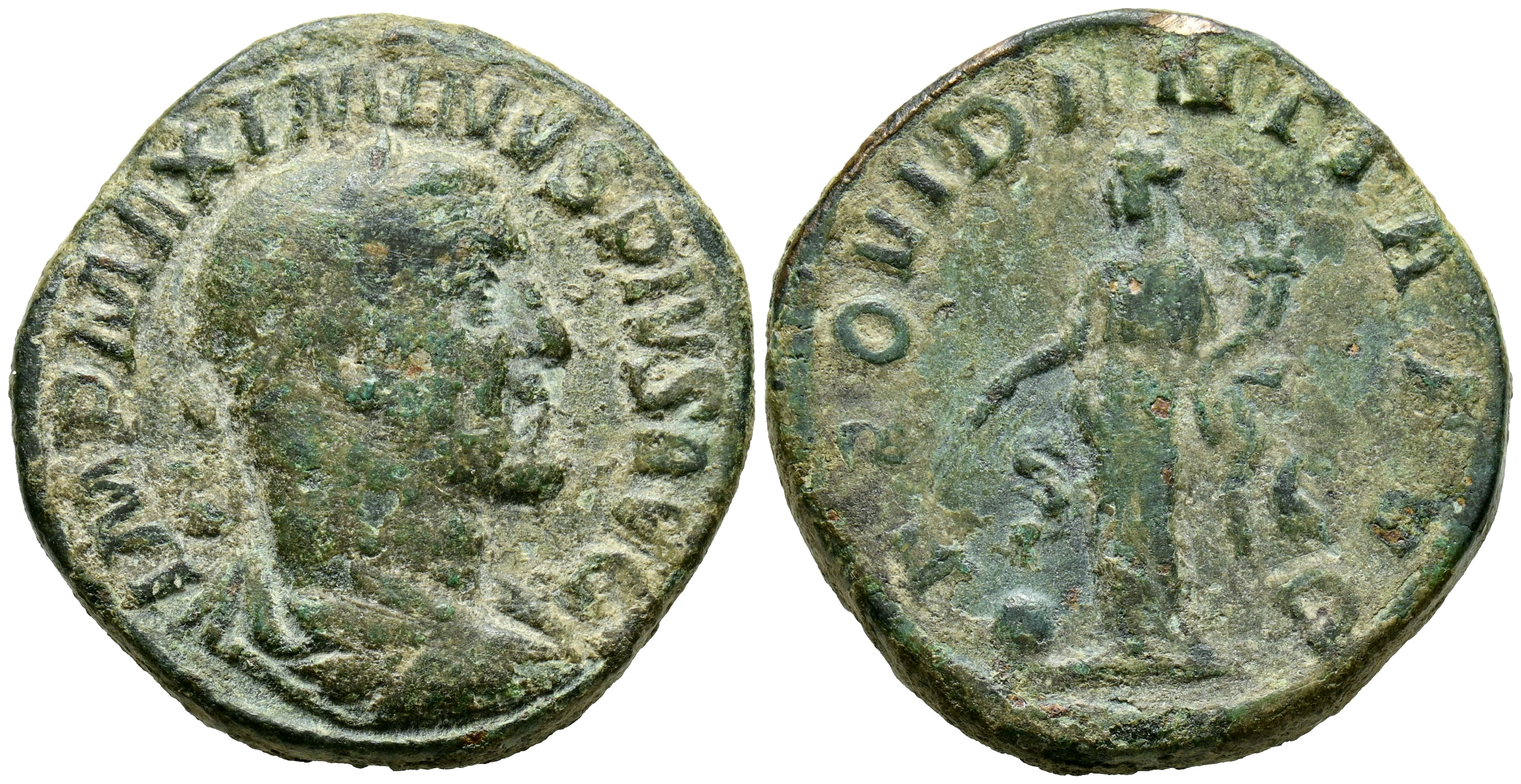 MAXIMINO I. Sestercio. (Ae. 19,03g/30mm). 235-236 d.C. Roma. (RIC 61). Anv: Busto laureado y drapeado de Maximino I a derecha, alrededor leyenda: IMP MAXIMINVS PIVS AVG. Rev: Providentia estante a izquierda portando cornucopia y vara sobre globo, entre: S-C, alrededor leyenda: PROVIDENTIA AVG. MBC-.