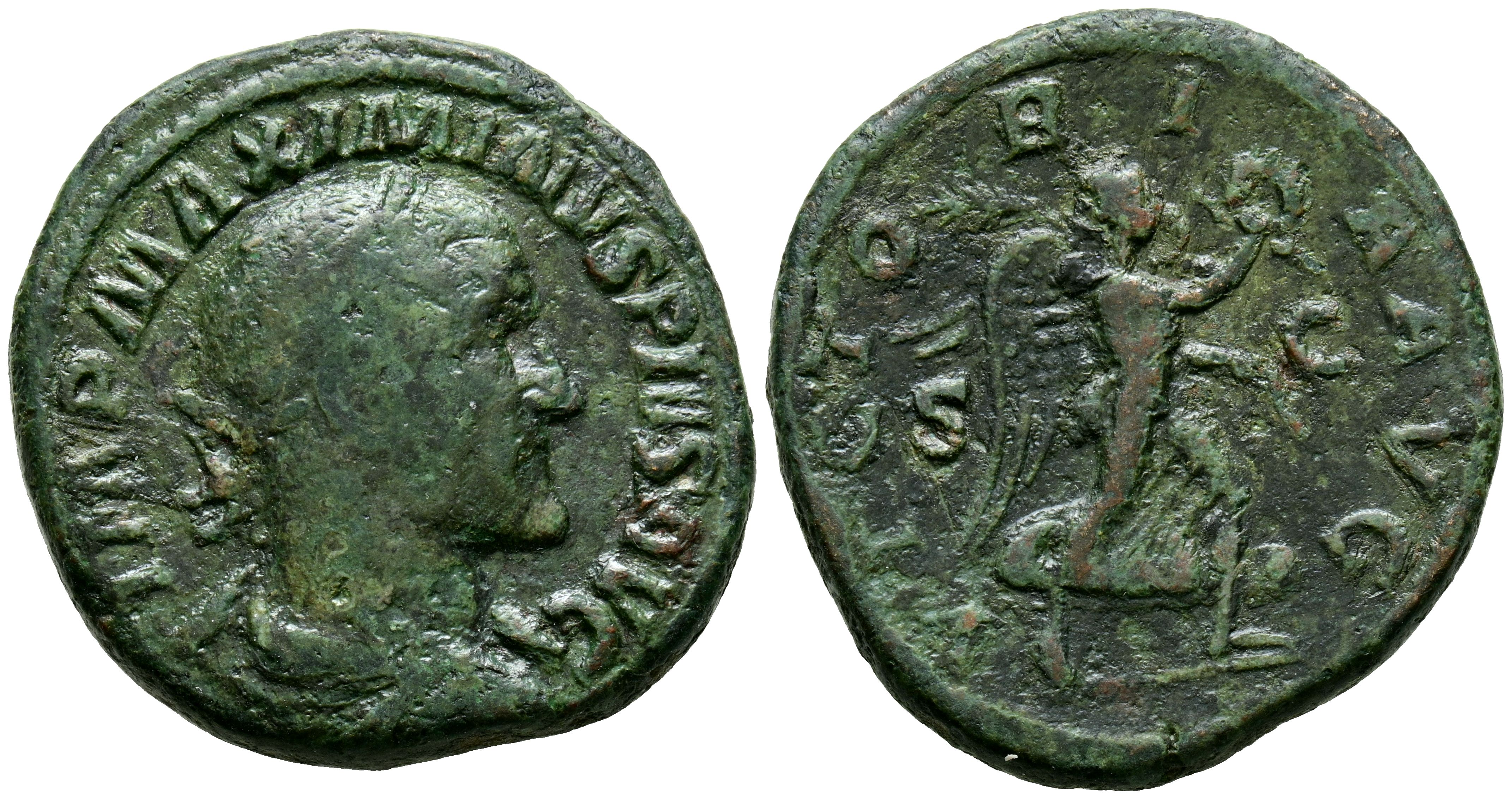 MAXIMINO I. Sestercio. (Ae. 20,33g/32mm). 236 d.C. Roma. (RIC 67). Anv: Busto laureado y drapeado de Maximino I a derecha, alrededor leyenda: IMP MAXIMINVS PIVS AVG. Rev: Victoria avanzando a derecha portando patera y palma, entre: S-C, alrededor leyenda: VICTORIA AVG. MBC-. Pátina verde.