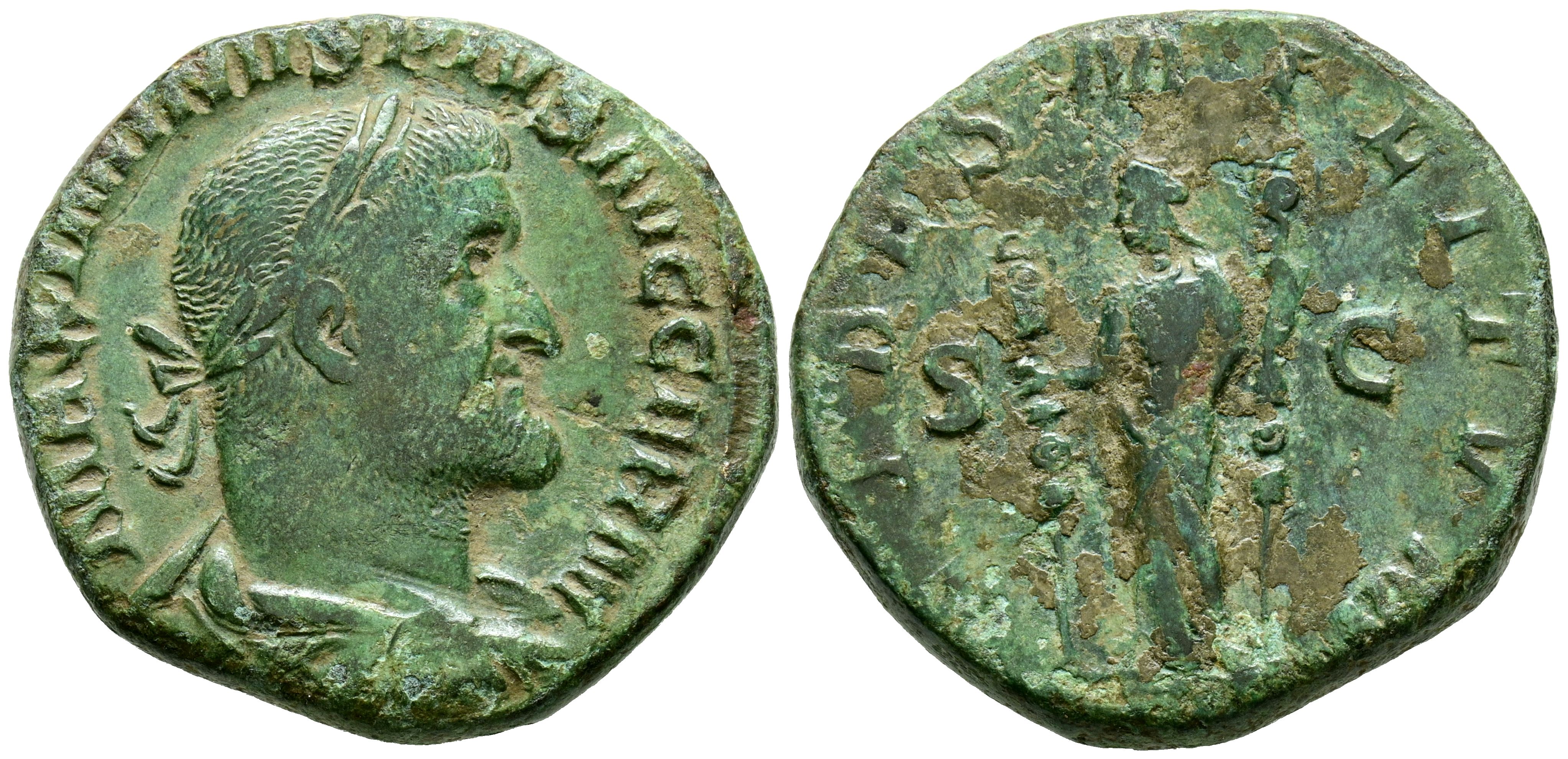 MAXIMINO I. Sestercio. (Ae. 17,28g/29mm). 236-238 d.C. Roma. (RIC 78). Anv: Busto laureado y drapeado de Maximino I a derecha, alrededor leyenda: MAXIMINVS PIVS AVG GERM. Rev: Fides estante a izquierda portando dos estandartes, entre S-C, alrededor leyenda: FIDES MILITVM. MBC/MBC-. Pátina verde.