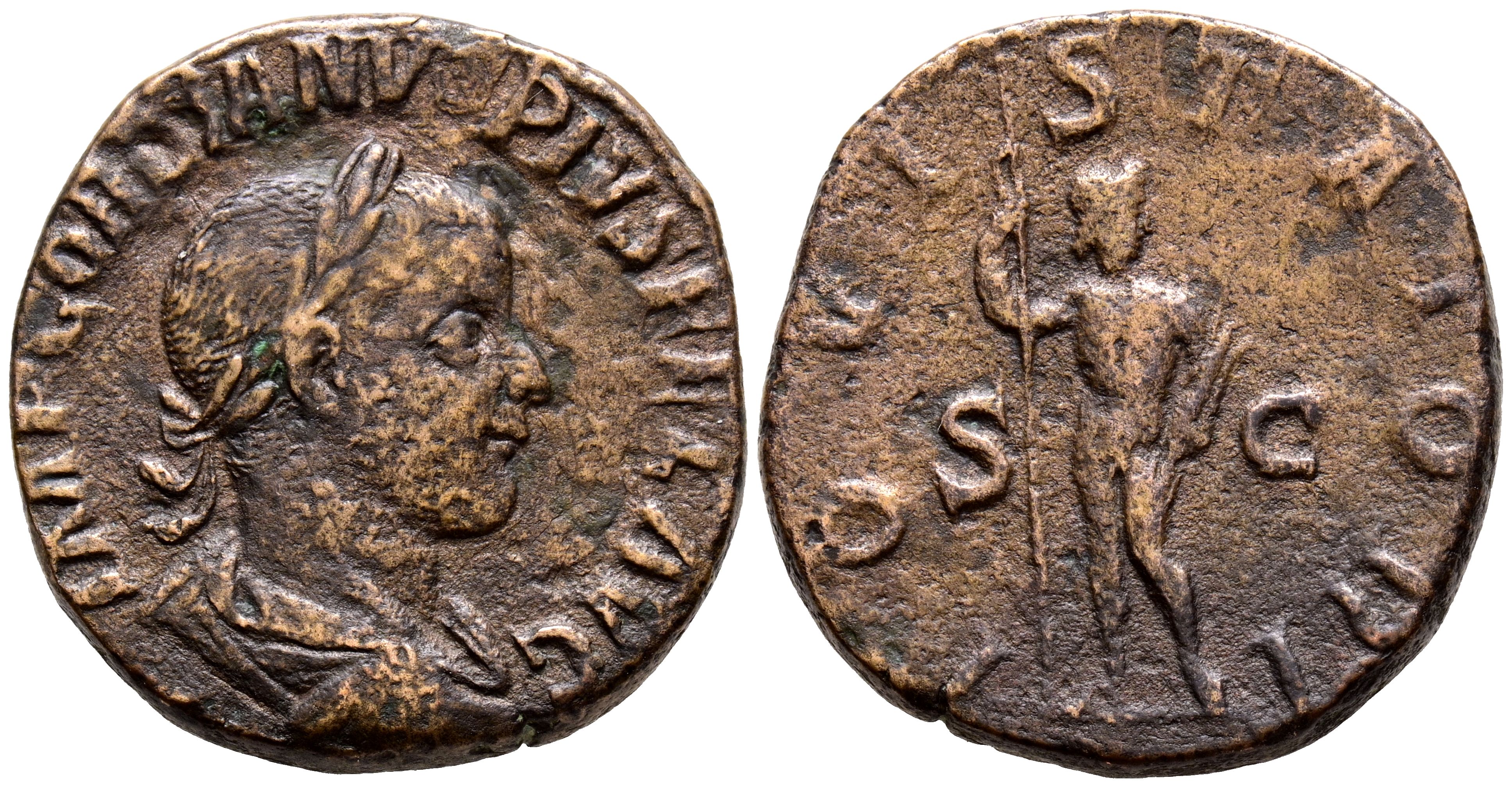 GORDIANO III. Sestercio. (Ae. 16,89g/28mm). 241-243 d.C. Roma. (RIC 298a). Anv: Busto laureado, drapeado y con coraza de Gordiano III a derecha, alrededor leyenda: IMP GORDIANVS PIVS FEL AVG. Rev: Júpiter estante a derecha portando lanza y haz de rayos, entre: S-C, alrededor leyenda: IOVI STATORI. MBC. Limpiada.