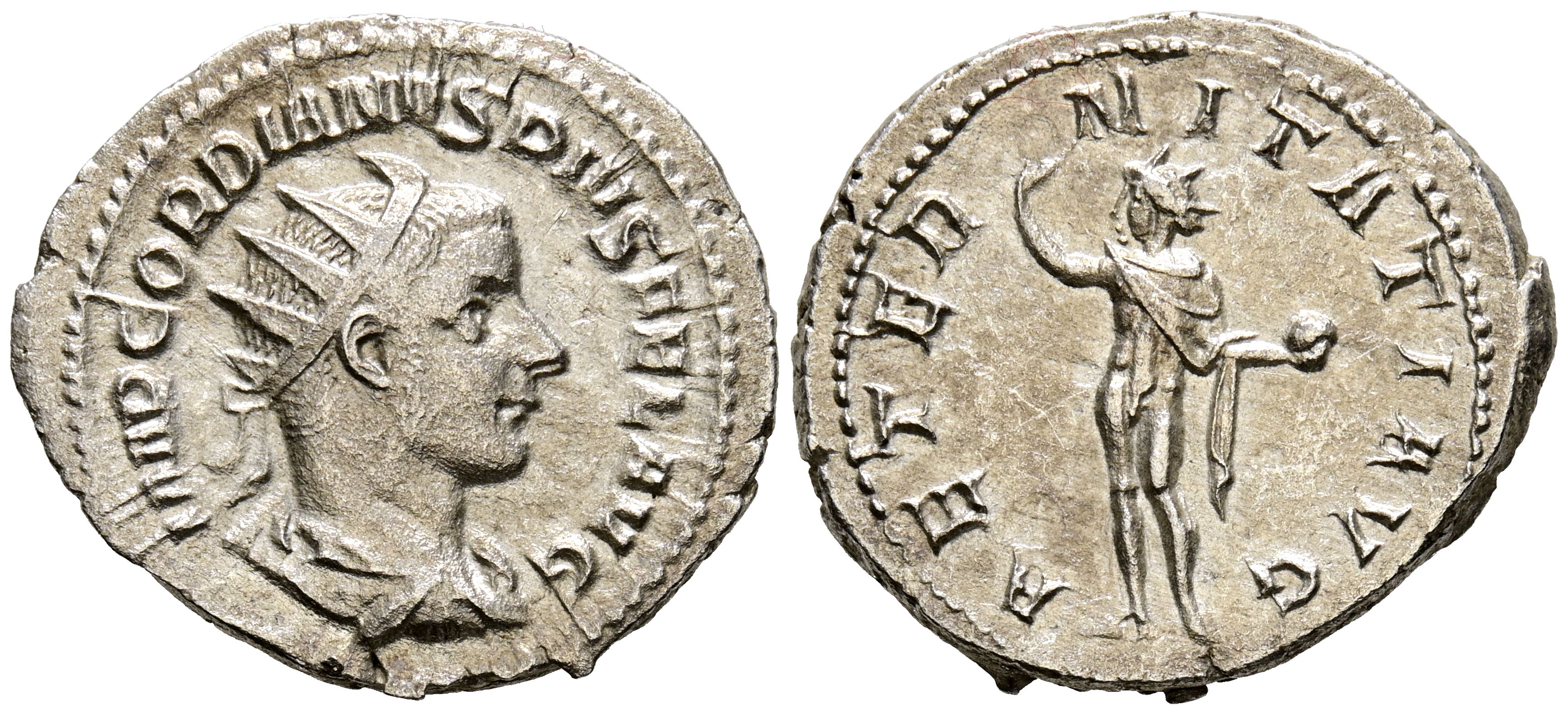 GORDIANO III. Antoniniano. (Ar. 4,44g/24mm). 241-243 d.C. Roma. (RIC 83). Anv: Busto radiado y drapeado de Gordiano III a derecha, alrededor leyenda: IMP GORDIANVS PIVS FEL AVG. Rev: Sol estante a izquierda alzando mano y portando globo, alrededor leyenda: AETERNITATI AVG. MBC+. Atractivo ejemplar.