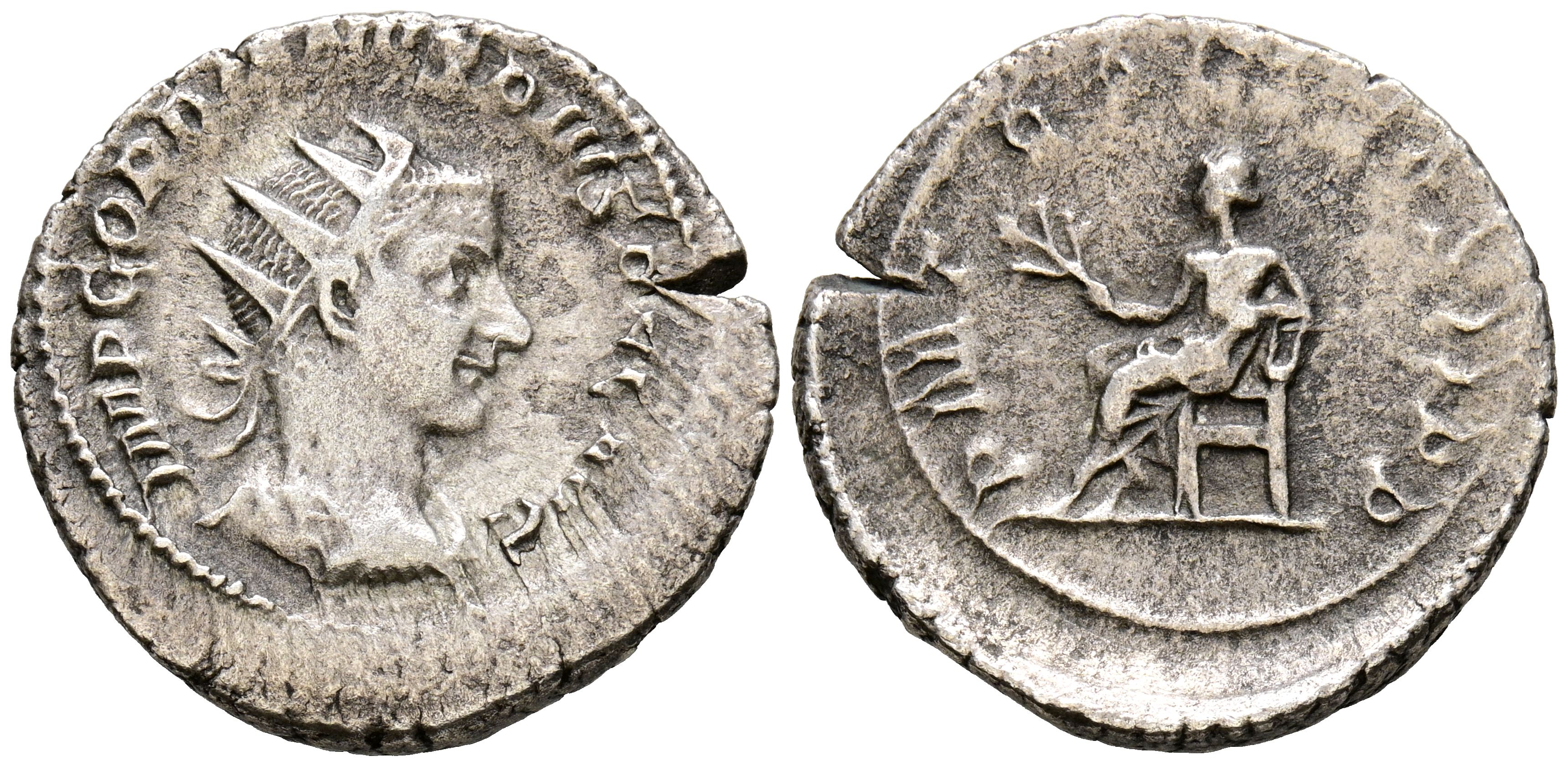 GORDIANO III. Antoniniano. (Ar. 3,77g/24mm). 241-243 d.C. Roma. (RIC 89). Anv: Busto radiado y drapeado de Gordiano III a derecha, alrededor leyenda: IMP GORDIANVS PIVS FEL AVG. Rev: Apolo sedente a la izquierda, portando rama y descansando el codo sobre lira, alrededor leyenda: P M TR P V COS II P P. MBC.