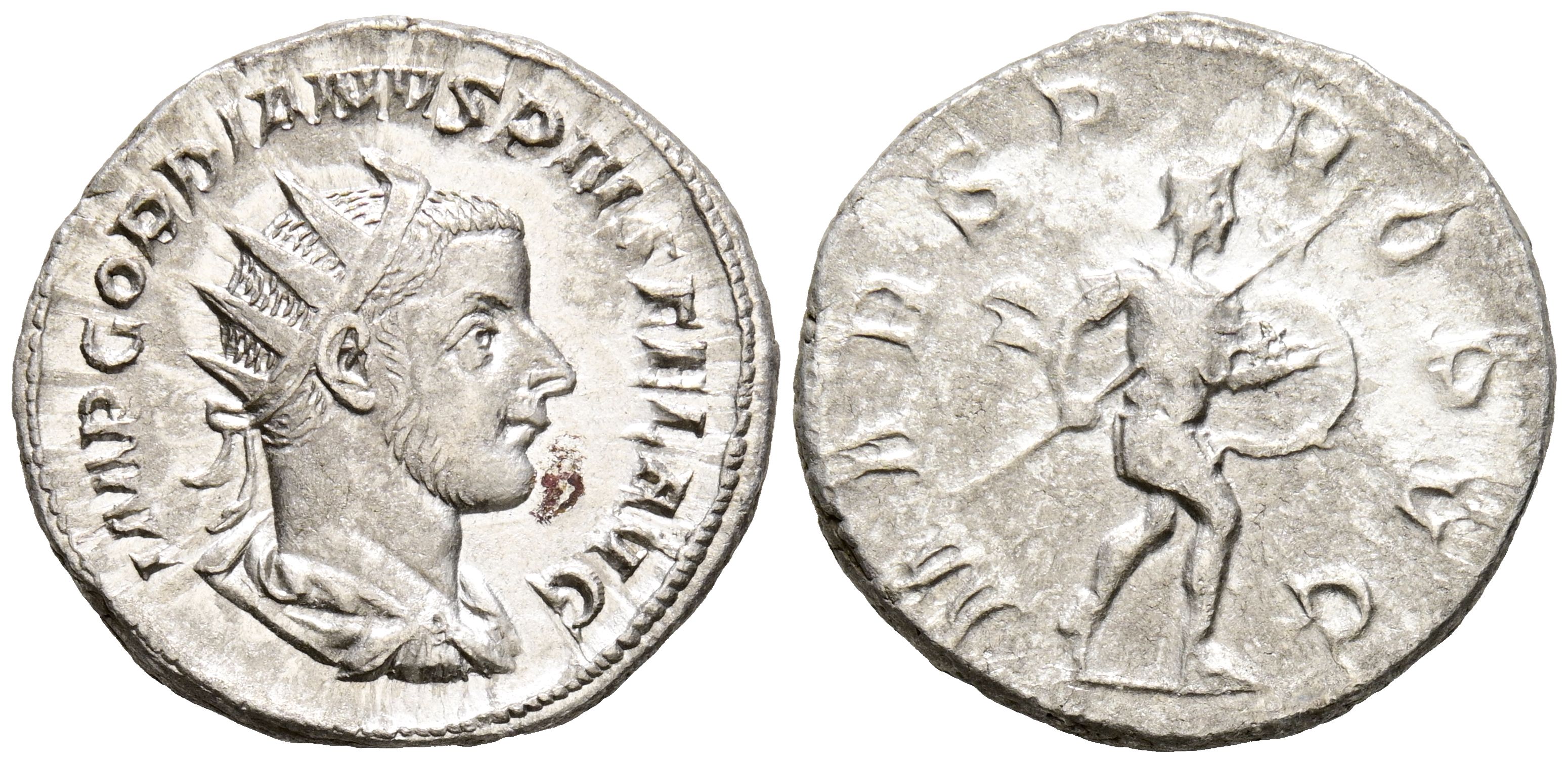 GORDIANO III. Antoniniano. (Ar. 4,43g/21mm). 238-244 d.C. Roma. (RIC 145). Anv: Busto radiado, drapeado y con coraza de Gordiano III a derecha, alrededor leyenda: IMP GORDIANVS PIVS FEL AVG. Rev: Marte avanzando a derecha portando escudo y lanza, alrededor leyenda: MARS PROPVG. MBC+/MBC. Restos de brillo original.