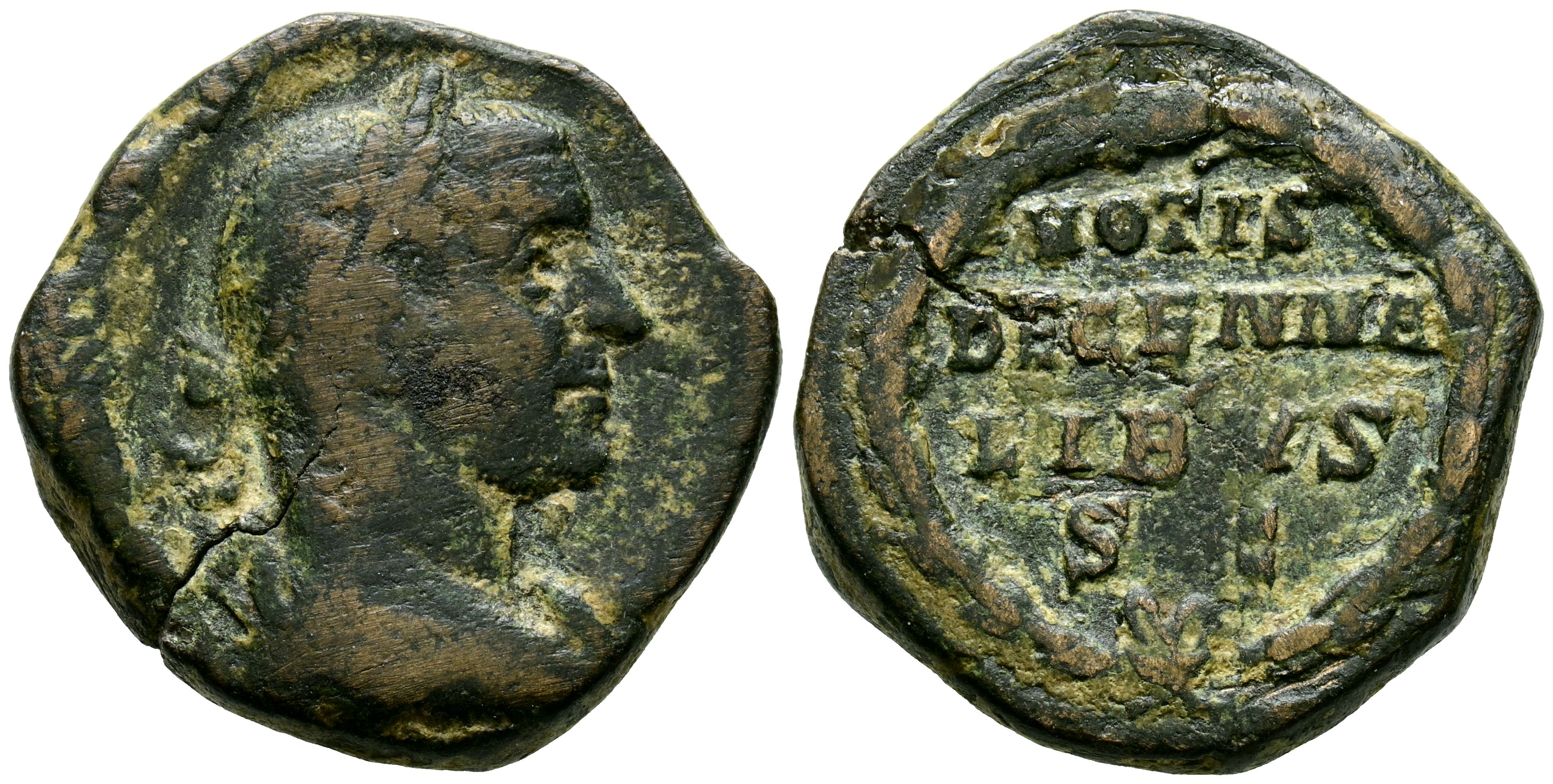 FILIPO I. Sestercio. (Ae. 15,46g/27mm). 247 d.C. Roma. (RIC 195a). Anv: Busto laureado y drapeado de Filipo I a derecha, alrededor leyenda: IMP M IVL PHILIPPVS AVG. Rev: Leyenda en cuatro líneas: VOTIS/DECENNA/LIBVS/SC, dentro de corona de laurel. MBC-/MBC. Grieta.