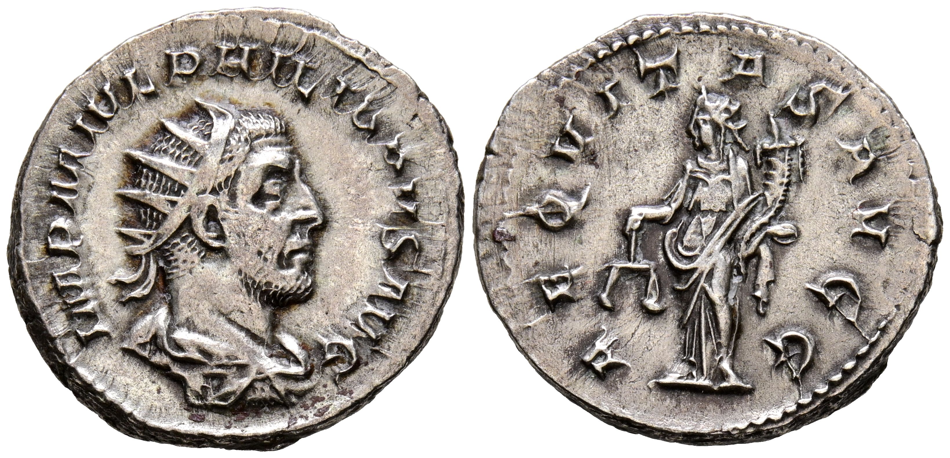 FILIPO I. Antoniniano. (Ar. 4,33g/23mm). 244-247 d.C. Roma. (RIC 27b). Anv: Busto radiado y drapeado de Filipo I a derecha, alrededor leyenda: IMP M IVL PHILIPPVS AVG. Rev: Aequitas estante a izquierda portando escalas y cornucopia, alrededor leyenda: AEQVITAS AVGG. MBC+.