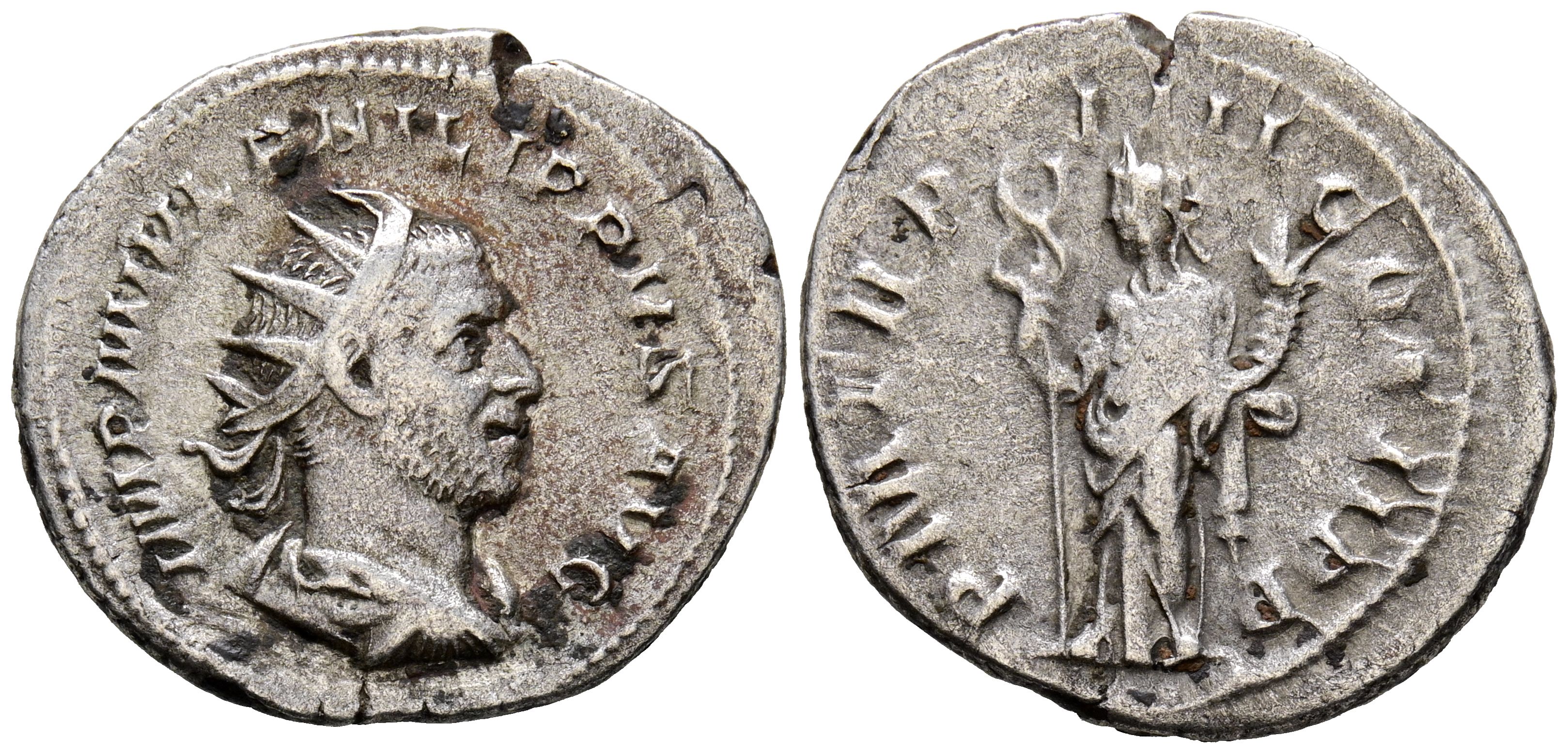 FILIPO I. Antoniniano. (Ar. 3,92g/22mm). 247 d.C. Antioquía. (RIC 76). Anv: Busto radiado y drapeado de Filipo I a derecha, alrededor leyenda: IMP M IVL PHILIPPVS AVG. Rev: Felicitas estante a izquierda con caduceo y cornucopia, alrededor leyenda: P M TR P IIII COS II P P. MBC-.