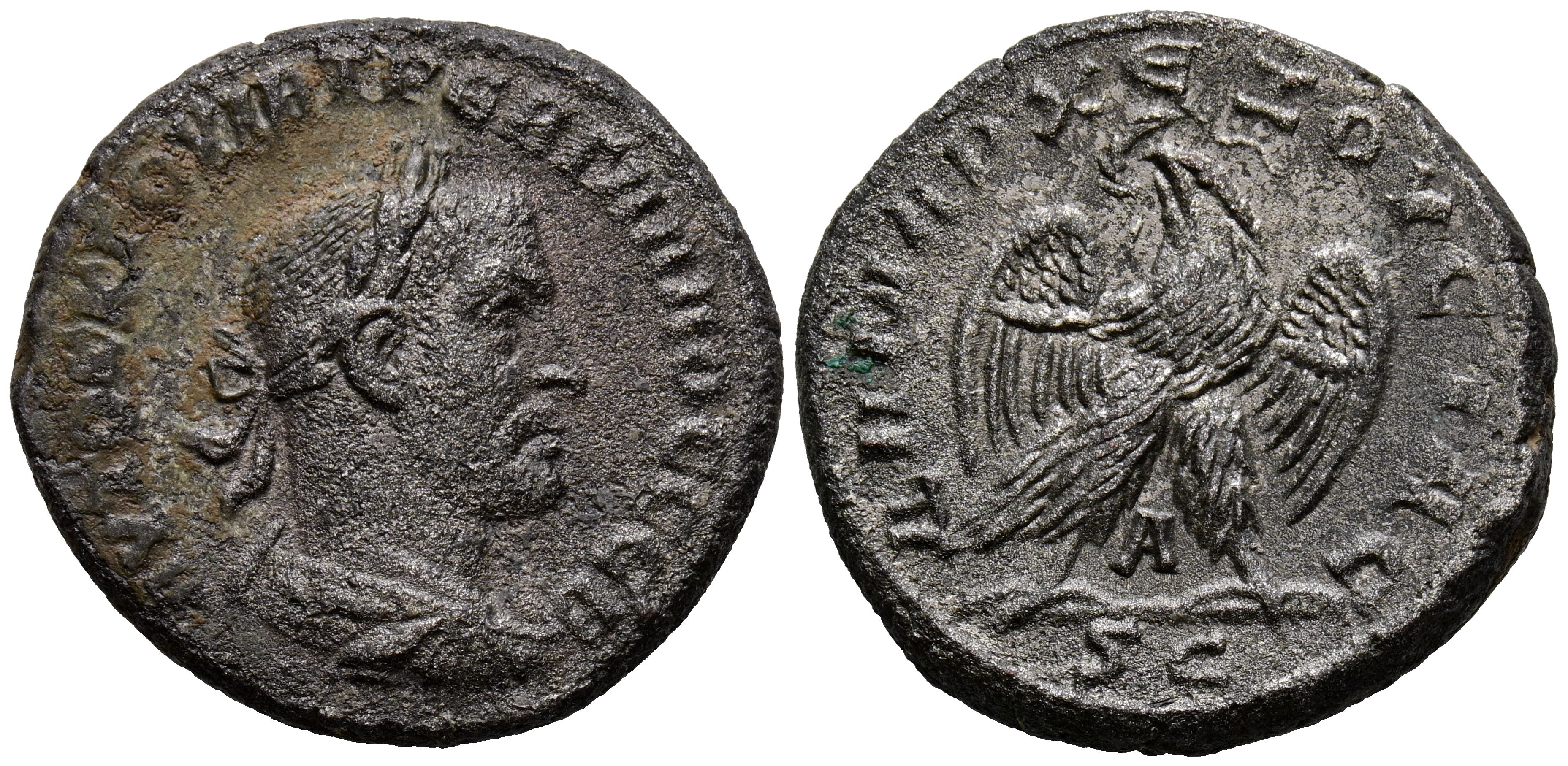 TREBONIANO GALO. Tetradracma. (Ar. 11,28g/26mm). 251-253 d.C. (RPC 1801). Anv: Busto laureado y drapeado de Treboniano Galo, detrás tres puntos, alrededor leyenda griega: AYTOK K Γ OYIB TPЄB ΓAΛΛOC CЄB. Rev: Águila estante de frente mirando a izquierda con corona de laurel en el pico, entre las patas A, en exergo: SC, alrededor leyenda griega: ΔHMAPX ЄΞOYCIAC. MBC.