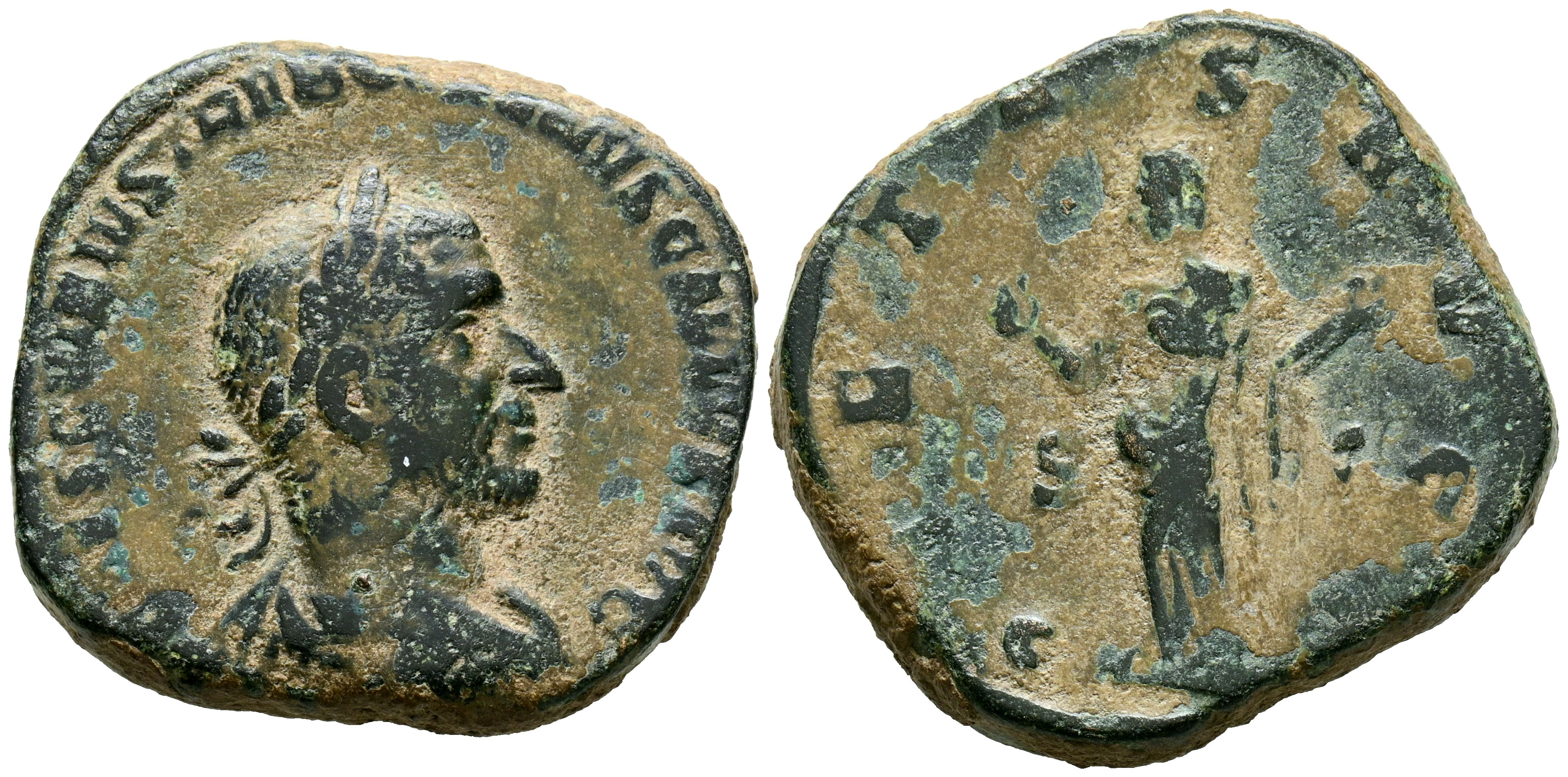 TREBONIANO GALO. Sestercio. (Ae. 20,10g/29mm). 251-253 d.C. Roma. (RIC 116a). Anv: Busto laureado y drapeado de Treboniano Galo a derecha, alrededor leyenda: IMP CAES C VIBIVS TREBONIANVS GALLVS AVG. Rev: Pietas estante a izquierda con ambas manos levantadas entre S-C, alrededor leyenda: PIETAS AVGG. MBC.