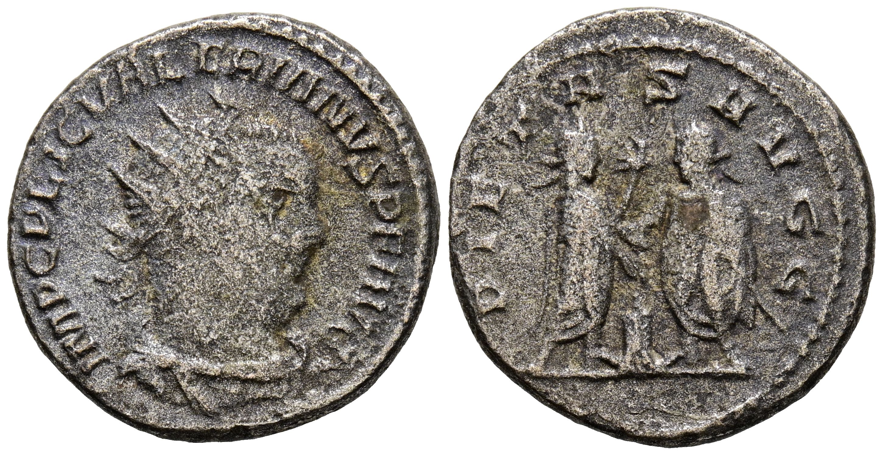 VALERIANO I. Antoniniano. (Ar. 3,79g/21mm). 256-260 d.C. Samosata. (RIC 285). Anv: Busto radiado y drapeado de Valeriano I a derecha, alrededor leyenda: IMP C P LIC VALERIANVS P F AVG. Rev: Valeriano I y Galieno enfrentados, entre ellos altar y ambos con cetros con águilas, alrededor leyenda: PIETAS AVGG. MBC.