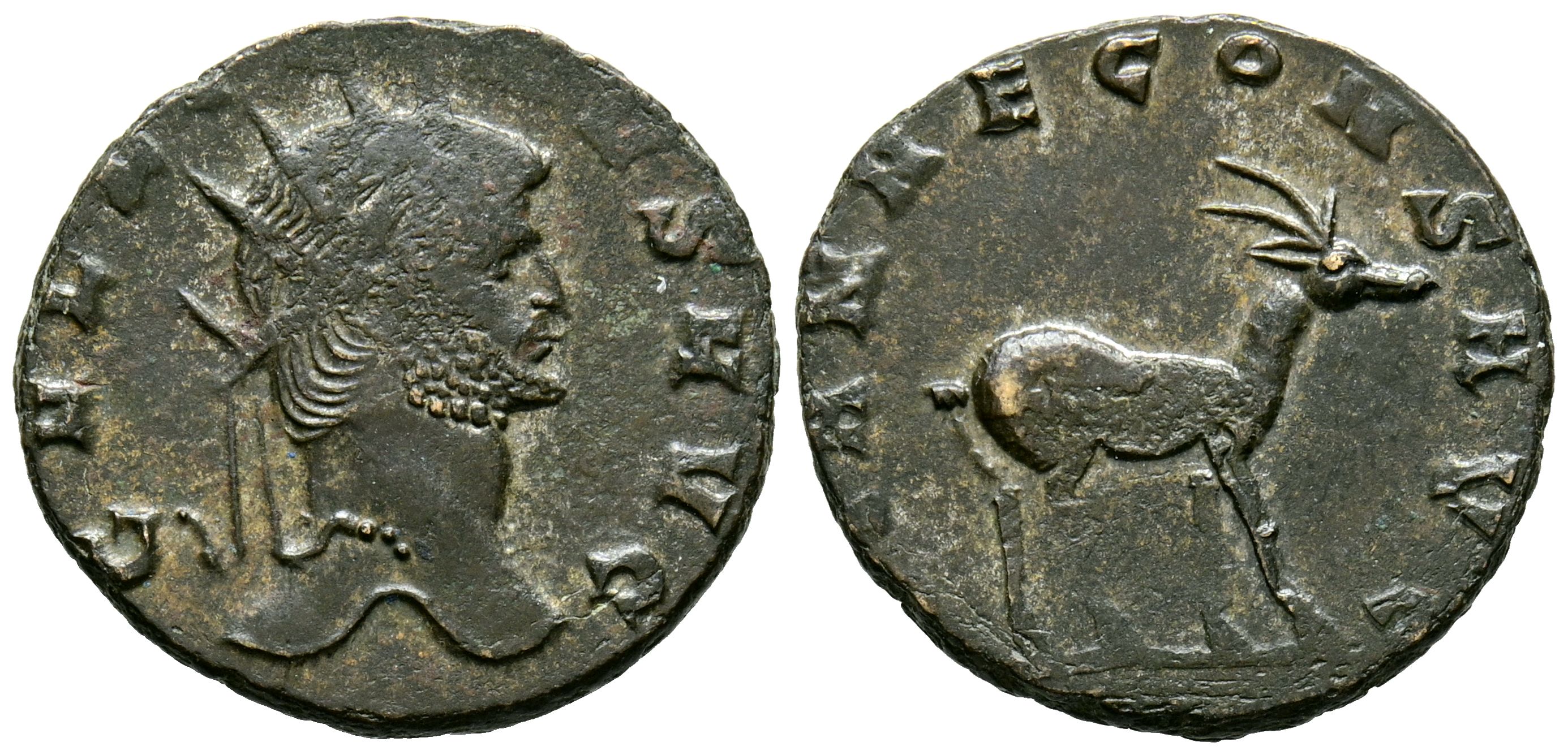 GALIENO. Antoniniano. (Ae. 3,06g/19mm). 260-268 d.C. Roma. (RIC 181). Anv: Cabeza radiada de Galieno a derecha, alrededor leyenda: GALLIENVS AVG. Rev: Antílope estante a derecha, debajo: XI, alrededor leyenda: DIANE CONS AVG. MBC+.