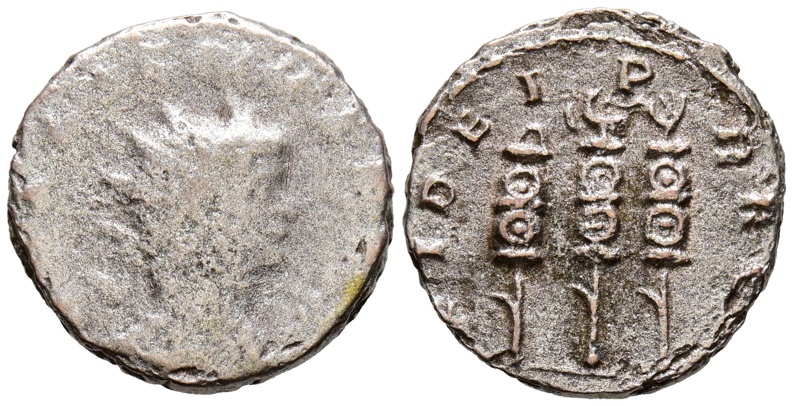 GALIENO. Antoniniano. (Ar. 3,20g/17mm). 262 d.C. Roma. (RIC 568). Anv: Busto radiado, drapeado y con coraza de Galieno a derecha, alrededor leyenda: GALLIENVS AVG. Rev: Aguila entre dos estandartes, alrededor leyenda: FIDEI PRAET. BC/MBC-. Raro ejemplar, con una leyenda propagandística que significa "A la lealtad de los pretorianos".