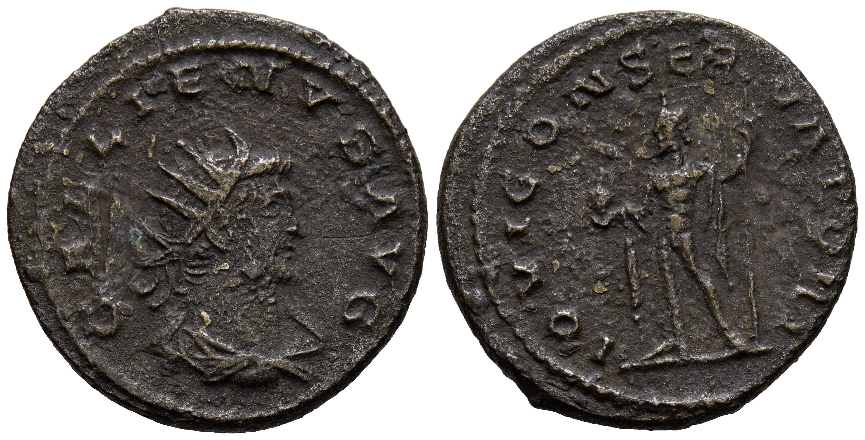 GALIENO. Antoniniano. (Ar. 4,52g/26mm). 266-267 d.C. Antioquía. (RIC 641). Anv: Busto radiado y drapeado de Galieno a derecha, alrededor leyenda: GALLIENVS AVG. Rev: Júpiter estante a izquierda portando cetro y globo, alrededor leyenda: IOVI CONSERVATORI. MBC-.