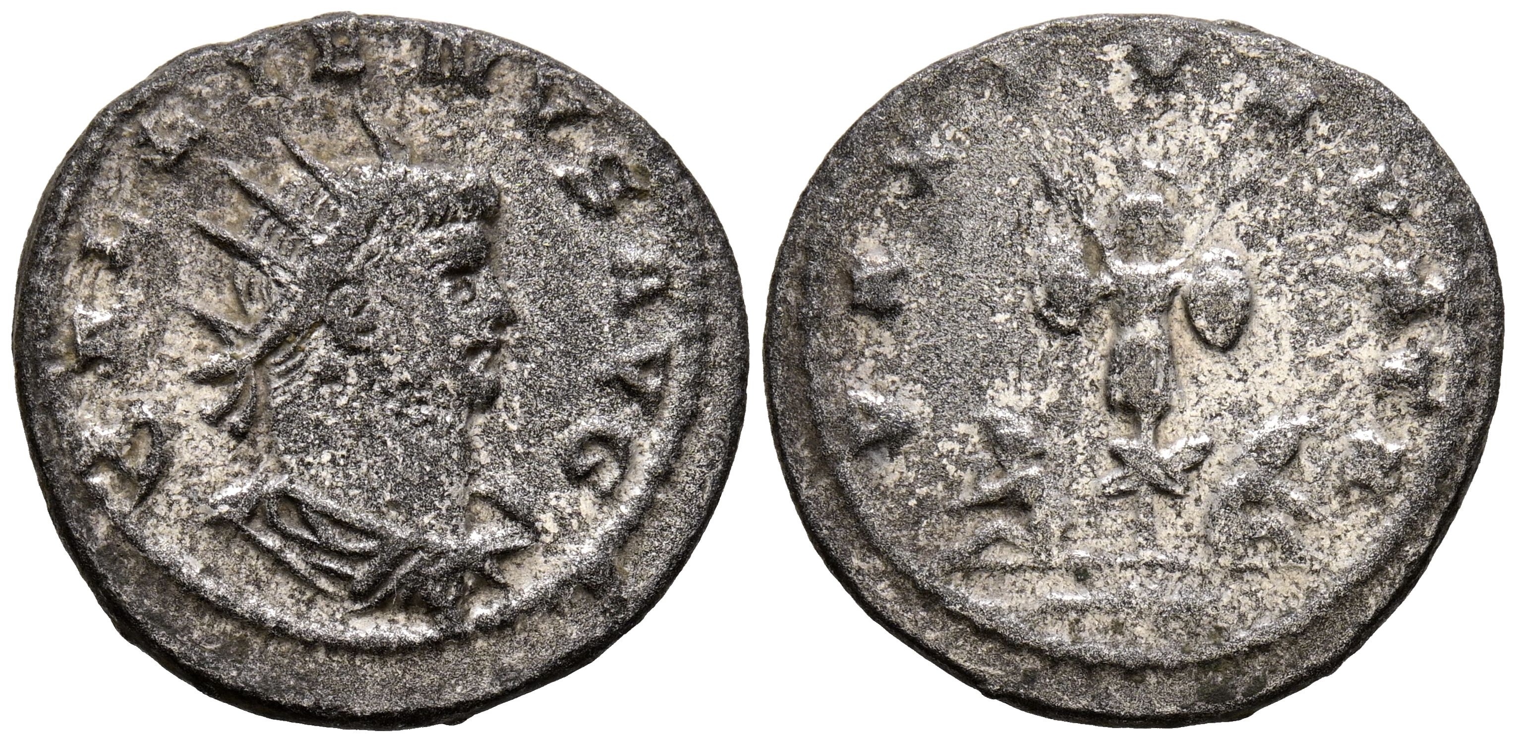 GALIENO. Antoniniano. (Ve. 3,50g/21mm). 264-265 d.C. Antioquía. (RIC 652). Anv: GALLIENVS AVG. Busto radiado y con coraza a la derecha . Rev: Trofeo entre dos cautivos sentados en el suelo, en exergo rama hacia la derecha, alrededor leyenda: PAX FVNDATA. MBC. Restos plateado de original.