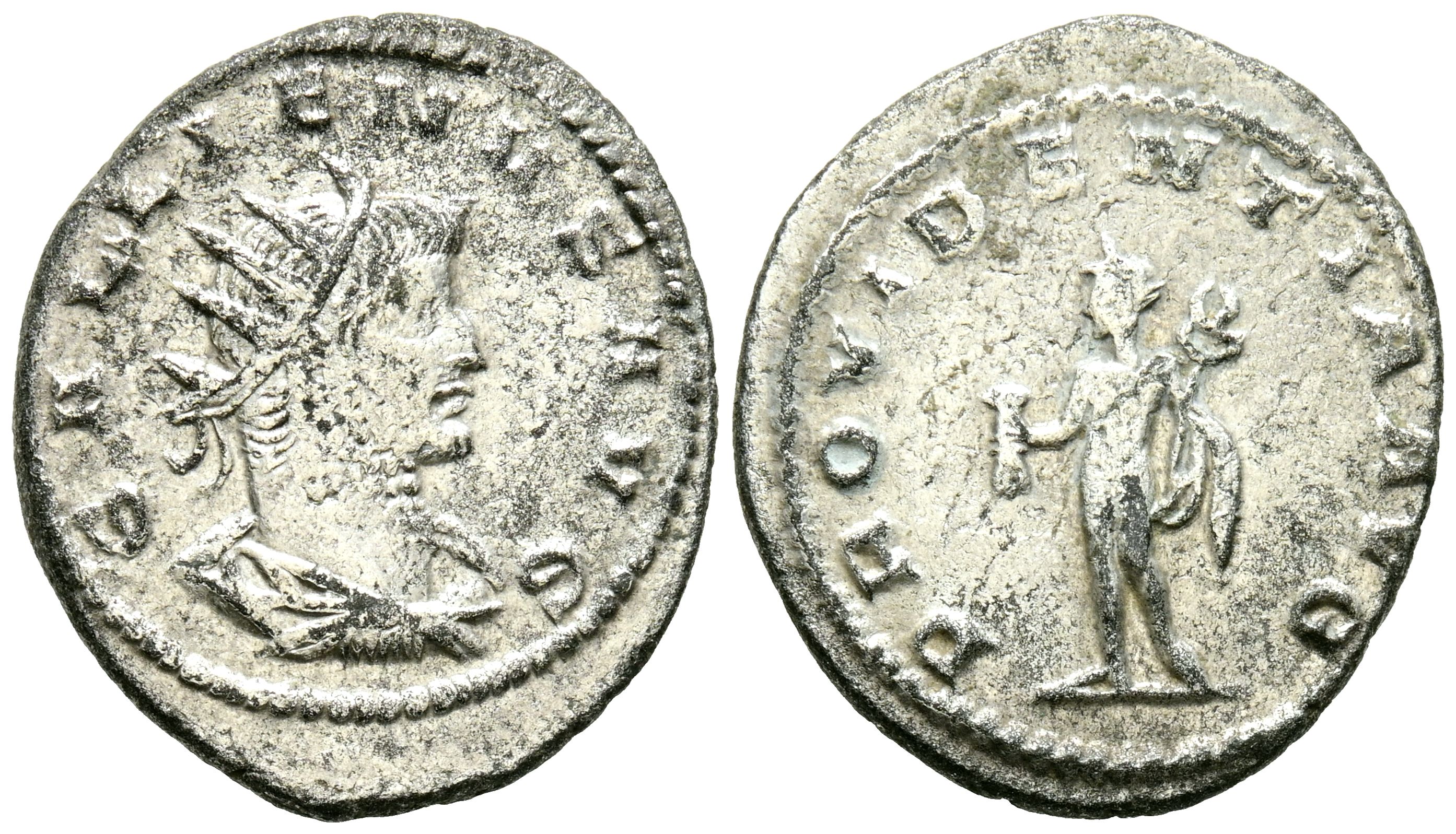 GALIENO. Antoniniano. (Ve. 3,38g/22mm). 264-265 d.C. Antioquía. (RIC 653). Anv: Busto radiado drapeado y con coraza de Galieno a derecha, alrededor leyenda: GALLIENVS AVG. Rev: Mercurio en pie a izquierda sosteniendo caduceo, alrededor leyenda: PROVIDENTIA AVG. MBC. Plateado original.