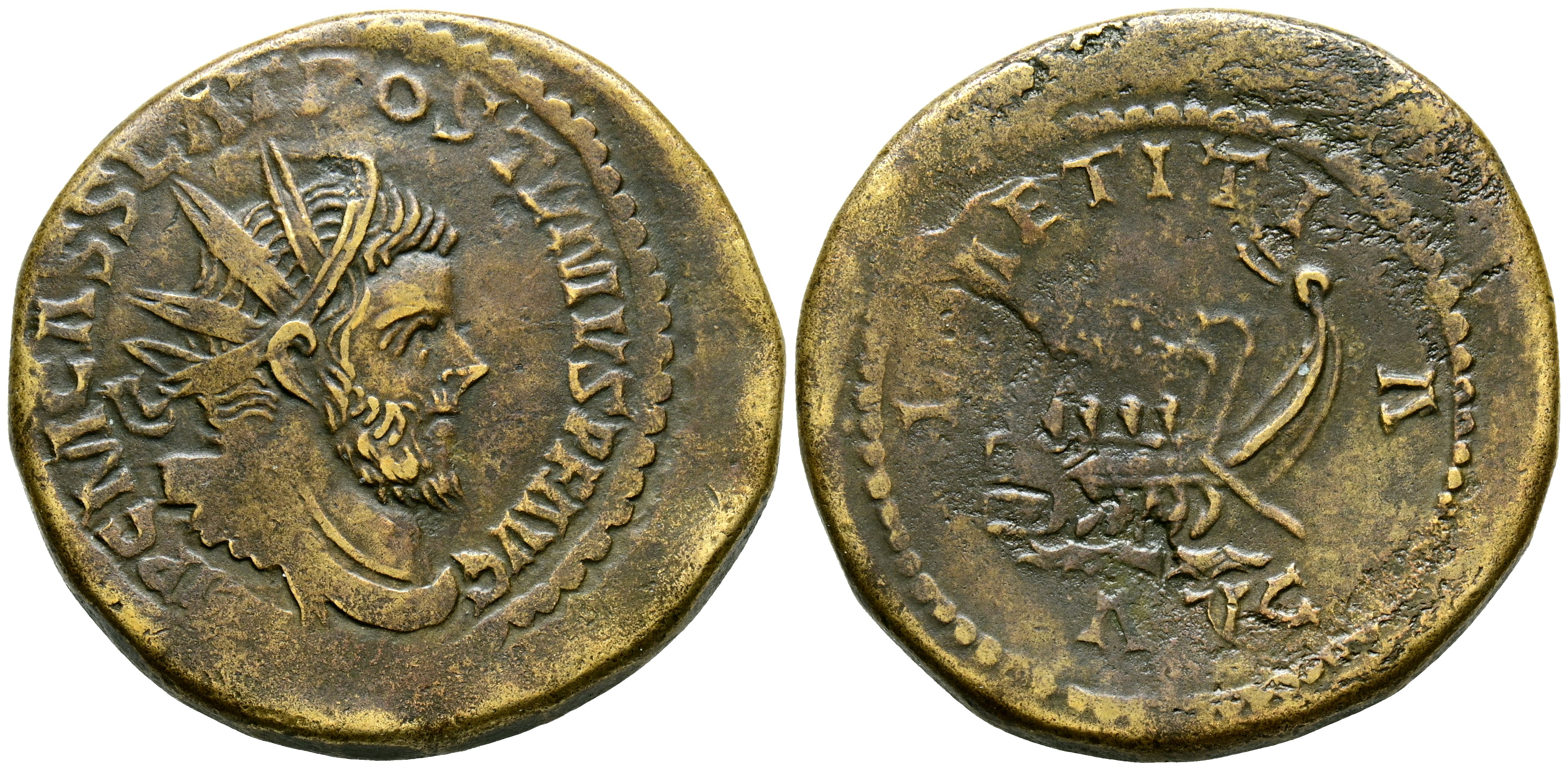 PÓSTUMO. Sestercio. (Ae. 20,63g/34mm). 260-269 d.C. Lugdunum. (RIC 143). Anv: Busto radiado y con coraza de Póstumo a derecha, alrededor leyenda: IMP C M CASS LAT POSTVMVS P F AVG. Rev: Galera, alrededor leyenda: LAETITIA AVG. MBC. Escaso ejemplar