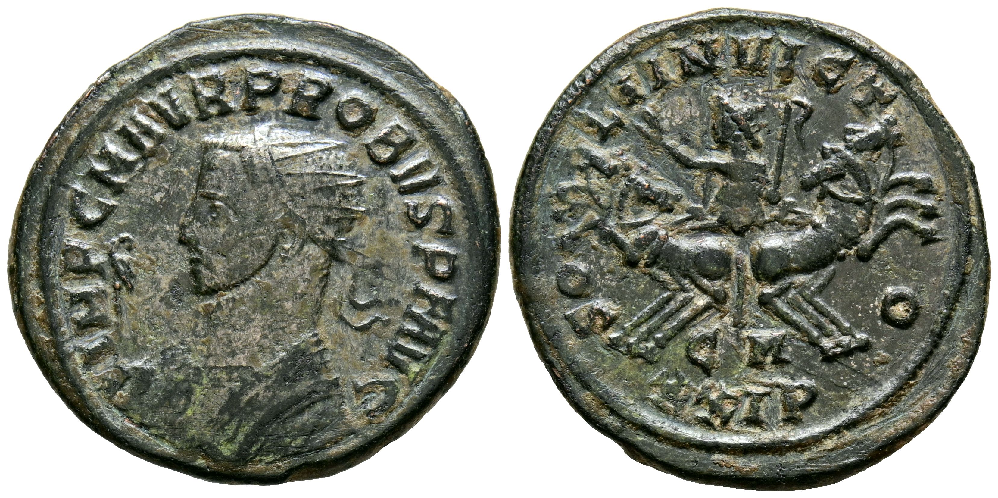 PROBO. Antoniniano. (Ae. 4,14g/24mm). 281 d.C. Cícico. (RIC 911). Anv: Busto coronado y con coraza de Probo a izquierda portando águila sobre estandarte, alrededor leyenda: IMP C M AVR PROBVS P F AVG. Rev: Sol sobre cuádriga de frente mirando a izquierda, alzando mano derecha y portando látigo, debajo: CM/XXI, alrededor leyenda: SOLI INVICTOS. MBC.
