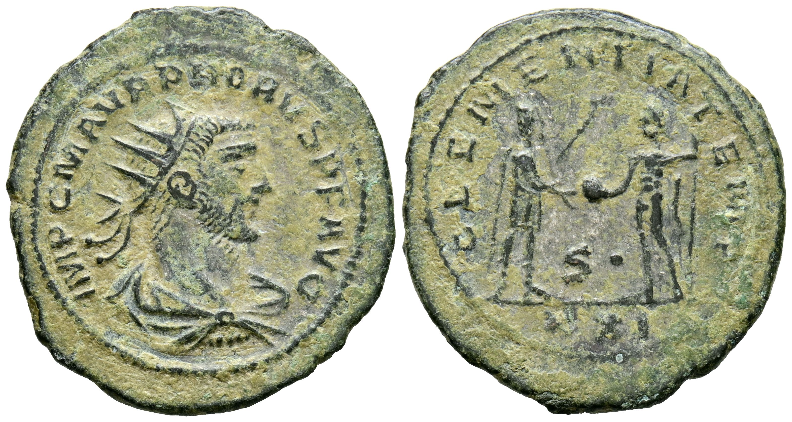 PROBO. Antoniniano. (Ae. 3,44g/24mm). 280 d.C. Antioquía. (RIC 922): Anv: Busto radiado y drapeado de Probo a derecha, alrededor leyenda: IMP C M AVR PROBVS P F AVG. Rev: Probo estante a derecha portando cetro y recibiendo Victoria con corona de laurel sobre globo de Júpiter estante a izquierda portando cetro, entre ellos S, en exergo: XXI, alrededor leyenda: CLEMENTIA TEMP. MBC.