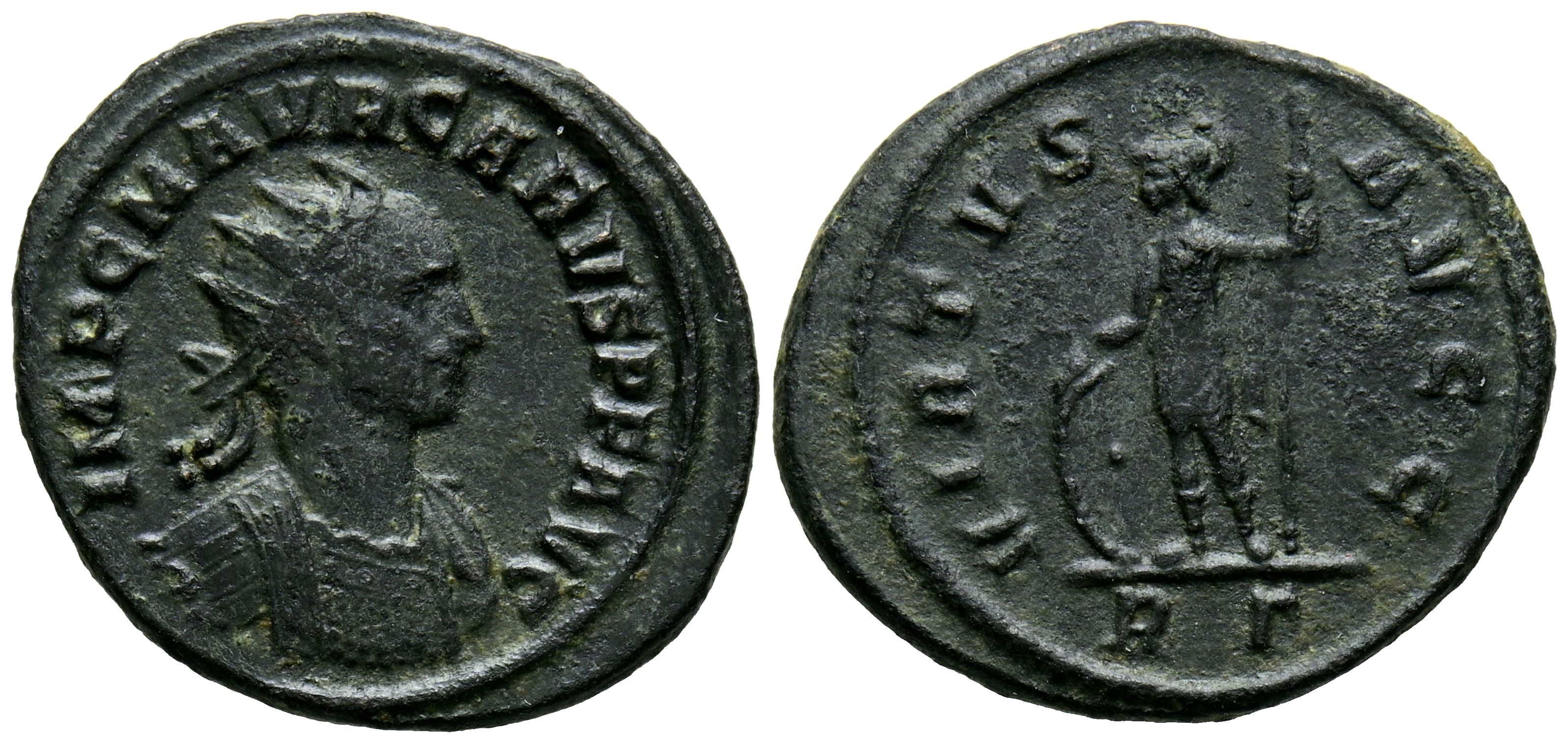 CARO. Antoniniano. (Ae. 4,06g/23mm). 282-283 d.C. Roma. (RIC 46). Anv: Busto radiado y con coraza de Caro a derecha, alrededor leyenda: IMP C M AVR CARVS P F AVG. Rev: Virtus estante a izquierda portando lanza y escudo, en exergo: RG, alrededor leyenda: VIRTVS AVGG. MBC.