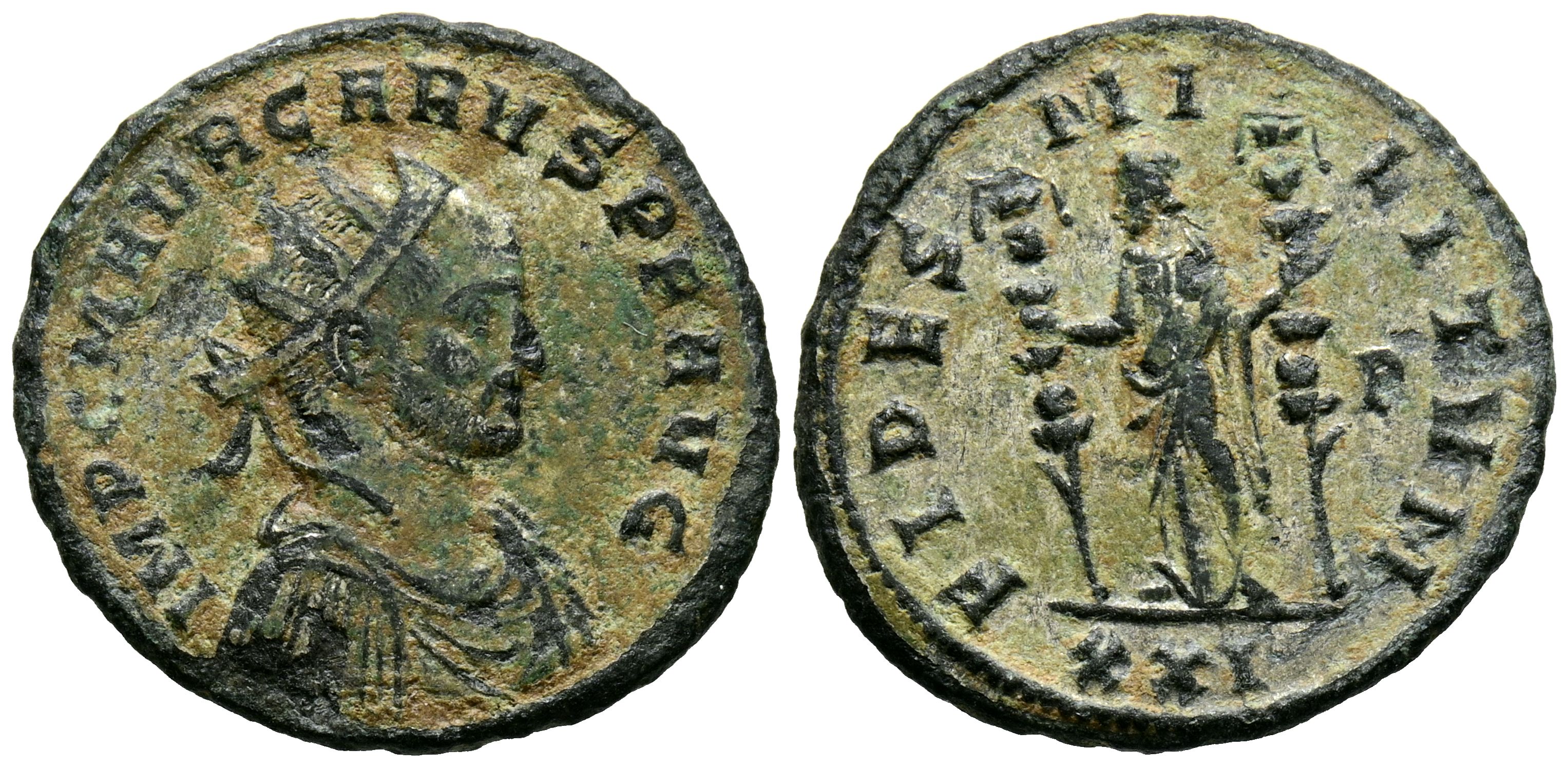 CARO. Antoniniano. (Ve. 3,56g/22mm). 282-283 d.C. Siscia. (RIC 102). Anv: Busto radiado y con coraza de Caro a derecha, alrededor leyenda: IMP C M AVR CARVS P F AVG. Rev: Fides estante a izquierda sosteniendo estandartes, en exergo: XXI, alrededor leyenda: FIDES MILITVM. MBC. Ligeros restos de plateado original.