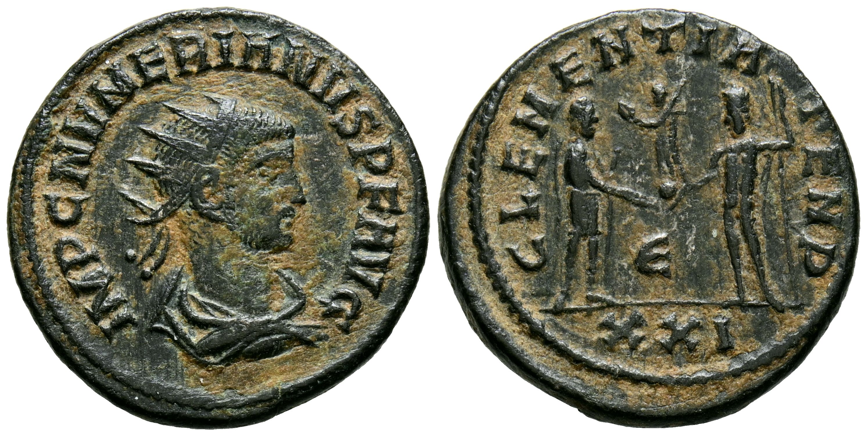 NUMERIANO. Antoniniano. (Ae. 3,77g/21mm). Cícico. (RIC 473). Anv: Busto radiado y drapeado de Numeriano a derecha, alrededor leyenda: IMP C NVMERIANVS P F AVG. Rev: Numeriano estante a derecha recibiendo Victoria con corona de laurel de Júpiter estante a izquierda portando cetro, entre ellos A, en exergo: XXI, alrededor leyenda: CLEMENTIA TEMP. MBC.