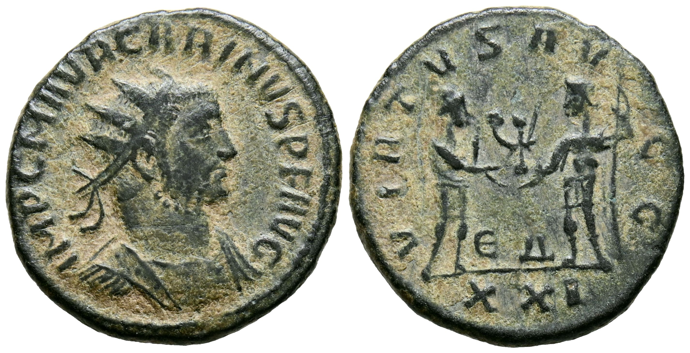 CARINO. Antoniniano. (Ae. 3,77g/20mm). 283 d.C. Antioquía. (RIC 325). Anv: Busto radiado y con coraza de Carino a derecha, alrededor leyenda: IMP C M AVR CARINVS P F AVG. Rev: Carino estante a derecha portando cetro y recibiendo Victoria con corona de laurel de Caro a izquierda portando cetro, entre ellos: E y A, en exergo: XXI, alrededor leyenda: VIRTVS AVGG. MBC.