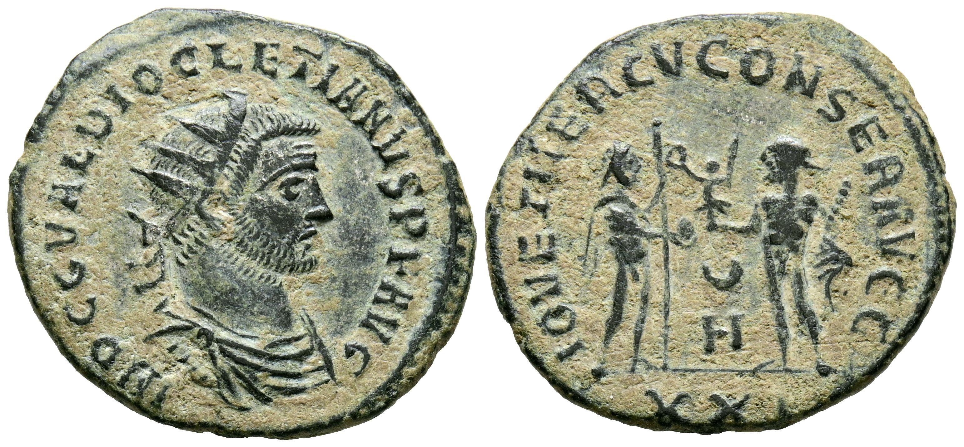 DIOCLECIANO. Antoniniano. (Ae. 3,48g/22mm). 285 d.C. Antioquía. (RIC 323). Anv: Busto radiado y con coraza de Diocleciano a derecha, alrededor leyenda: IMP C C VAL DIOCLETIANVS P F AVG. Rev: Júpiter estante a derecha portando lanza y globo enfrentado a Hércules estante a izquierda portando Victoria con corona de laurel, mazo y piel de león, entre ellos, creciente y H, en exergo: XXI, alrededor leyenda: IOV ET HERCV CONSER AVGG. MBC.