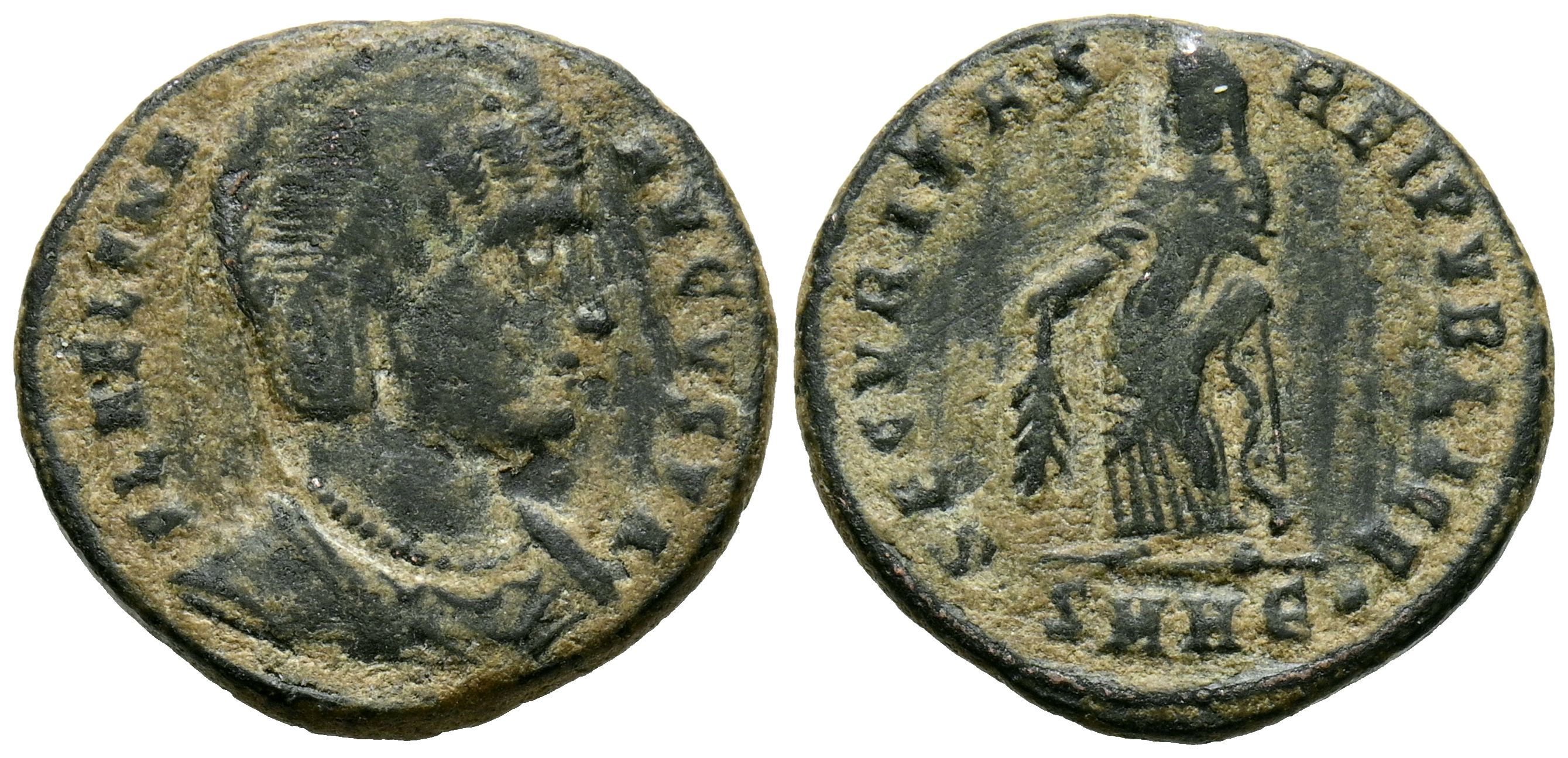 ELENA. Follis. (Ae. 3,10g/18mm). 325-326 d.C. Heráclea. (RIC 79). Anv: Busto diademado y con coraza de Elena a derecha, alrededor leyenda: FL HELENA AVGVSTA. Rev: Securitas estante a izquierda portando rama, en exergo: SMHE, alrededor leyenda: SECVRITAS REI PVBLICAE. MBC-.