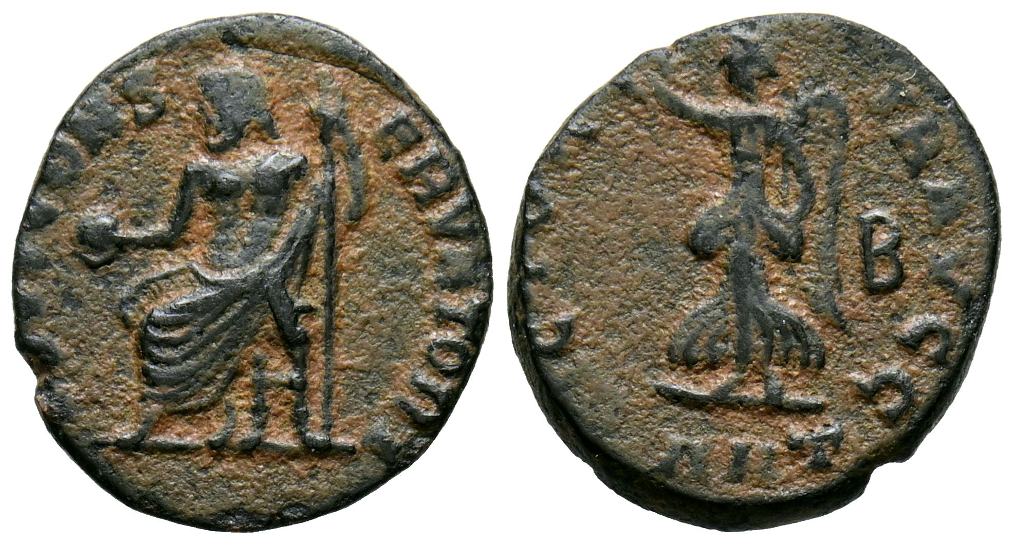 MAXIMINO II. Follis. (Ae. 1,42g/15mm). 310-313 d.C. Antioquía. (McAlee 171b). Anv: Júpiter sentado a la izquierda sosteniendo el globo en la mano derecha y cetro con la izquierda, alrededor leyenda: IOVI CONSERVATORI. Rev: Victoria avanzando a izquierda sosteniendo corona de laureal a derecha y palma a izquierda, en campo: B, alrededor leyenda: VICTORIA AVGG, en exergo: ANT. MBC.