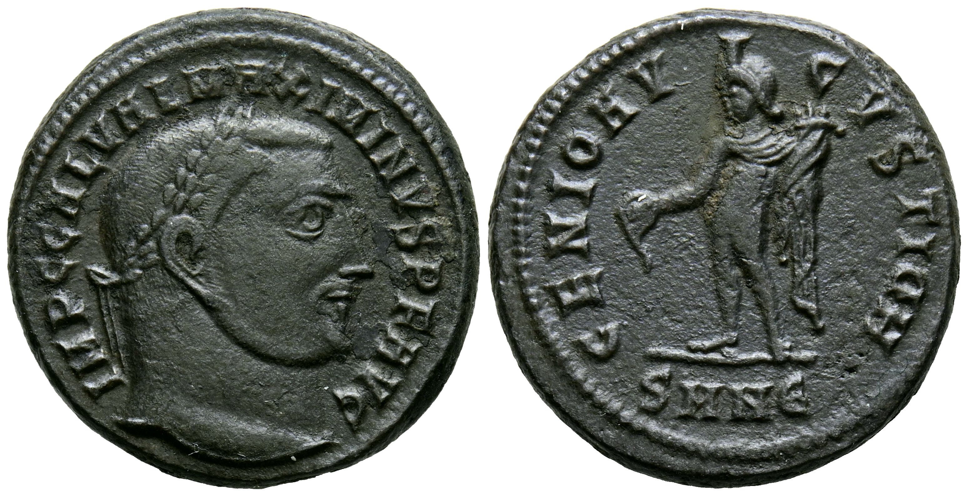 MAXIMINO II. Follis. (Ae. 7,10g/22mm). 310-311 d.C. Nicomedia. (RIC 66c). Anv: Busto laureado de Maximino II a derecha, alrededor leyenda: IMP C GAL VAL MAXIMINVS P F AVG. Rev: Genio estante a derecha con cornucopia y patera, en exergo: SMNE, alrededor leyenda: GENIO AVGVSTI CH. MBC.