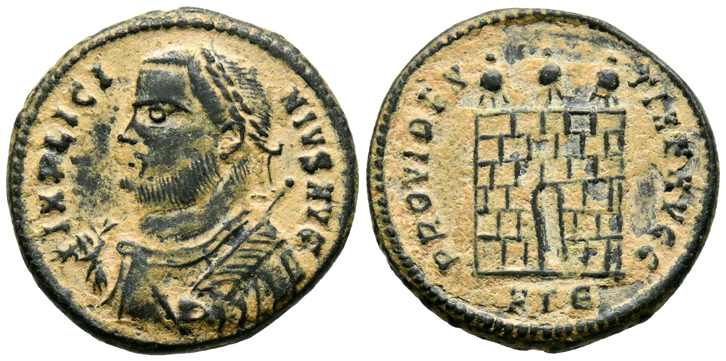 LICINIO I. Follis. (Ae. 3,40g/19mm). 318-320 d.C. Heráclea. (RIC 15). Anv: Busto laureado y drapeado a izquierda de Licinio I portando mappa y globo y cetro, alrededor leyenda: IMP LICINIVS AVG. Rev: Puerta de campamento con tres almenas, en exergo: HTE, alrededor leyenda: PROVIDENTIAE AVGG. MBC.