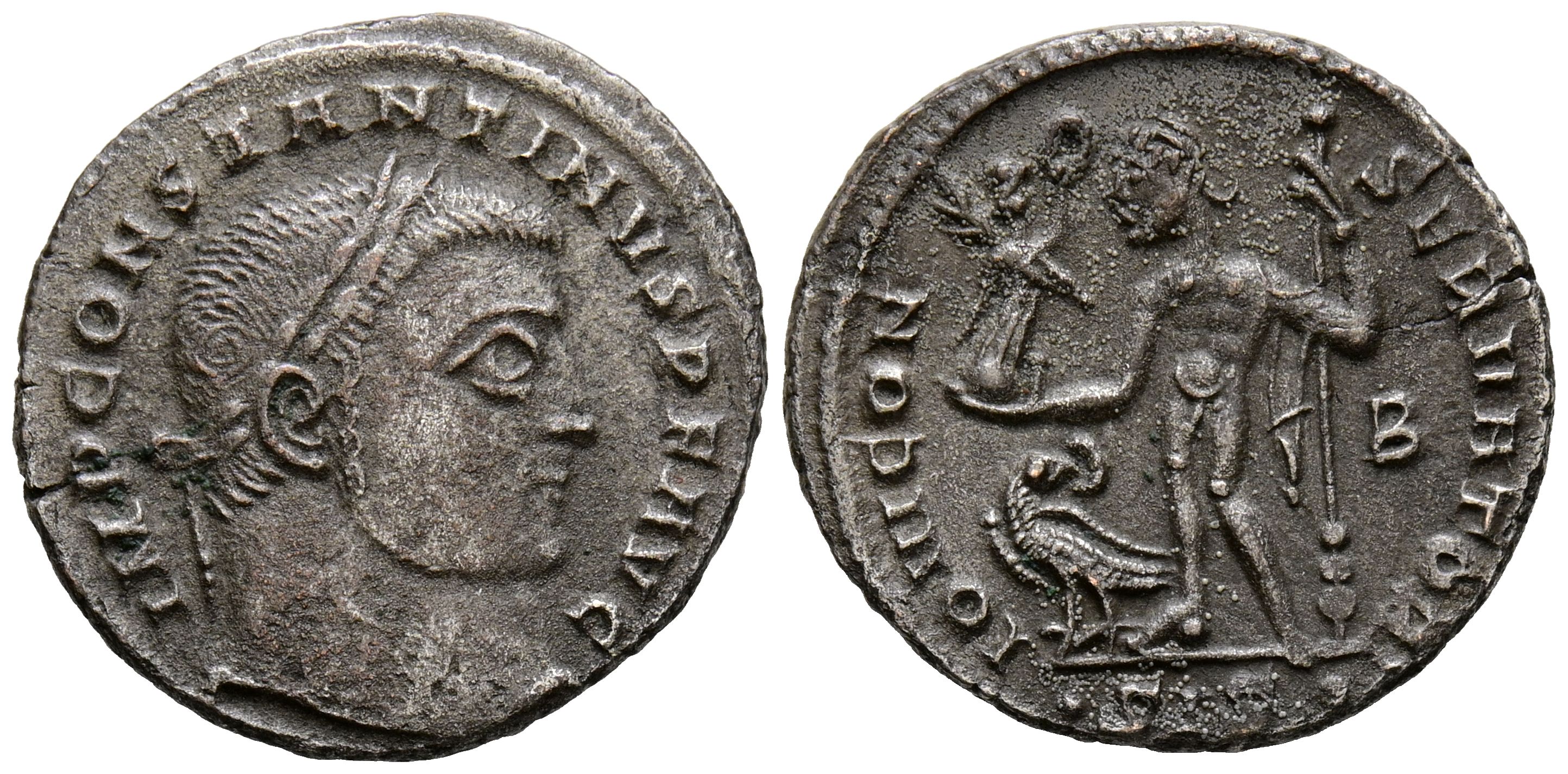 CONSTANTINO I. Follis. (Ae. 2,87g/20mm). 315-316 d.C. Siscia. (RIC 15). Anv: Cabeza laureada de Constantino I a derecha, alrededor leyenda: IMP CONSTANTINVS PF AVG. Rev: Júpiter estante a izquierda portando cetro y Victoria con corona de laurel, a sus pies águila con corona de laurel, en campo: B, en exergo: SIS, alrededor leyenda: IOVI CONSERVATORI. MBC.