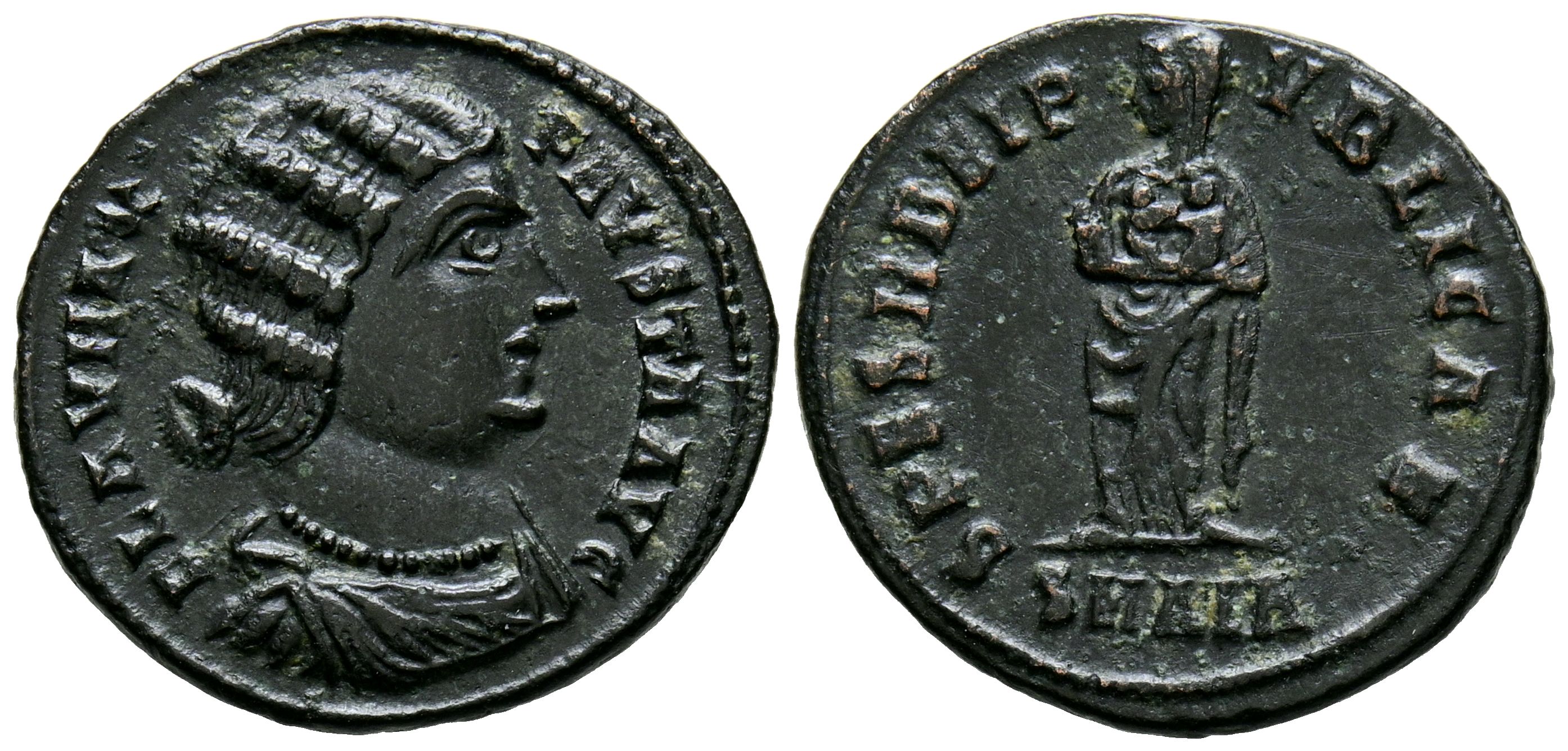 FAUSTA. Follis. (Ae. 3,16g/19mm). 326 d.C. Alejandria. (RIC 40). Anv: Busto drapeado de Fausta a derecha, alrededor leyenda: FLAV MAX FAVSTA AVG. Rev: Salus estante a izquierda portando dos niños, en exergo: SMALA, alrededor leyenda: SPES REIPVBLICAE. EBC-.