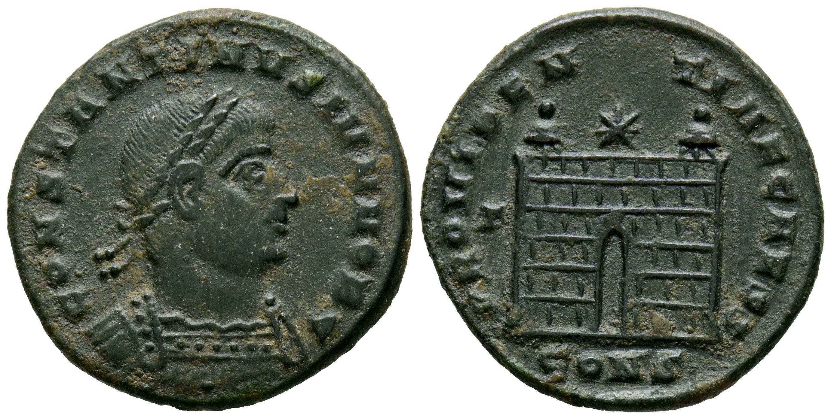 CONSTANCIO II. Follis. (Ae. 3,08g/19mm). 324-337 d.C. Constantinopla. (RIC 10). Anv: Busto laureado y drapeado de Constancio II a derecha, alrededor leyenda: FL IVL CONSTANTIVS NOB. Rev: Puerta de campamento, encima torretas entre estrella, a izquierda r, debajo: CONT, alrededor leyenda: PROVIDENTIAE CAESS. MBC.