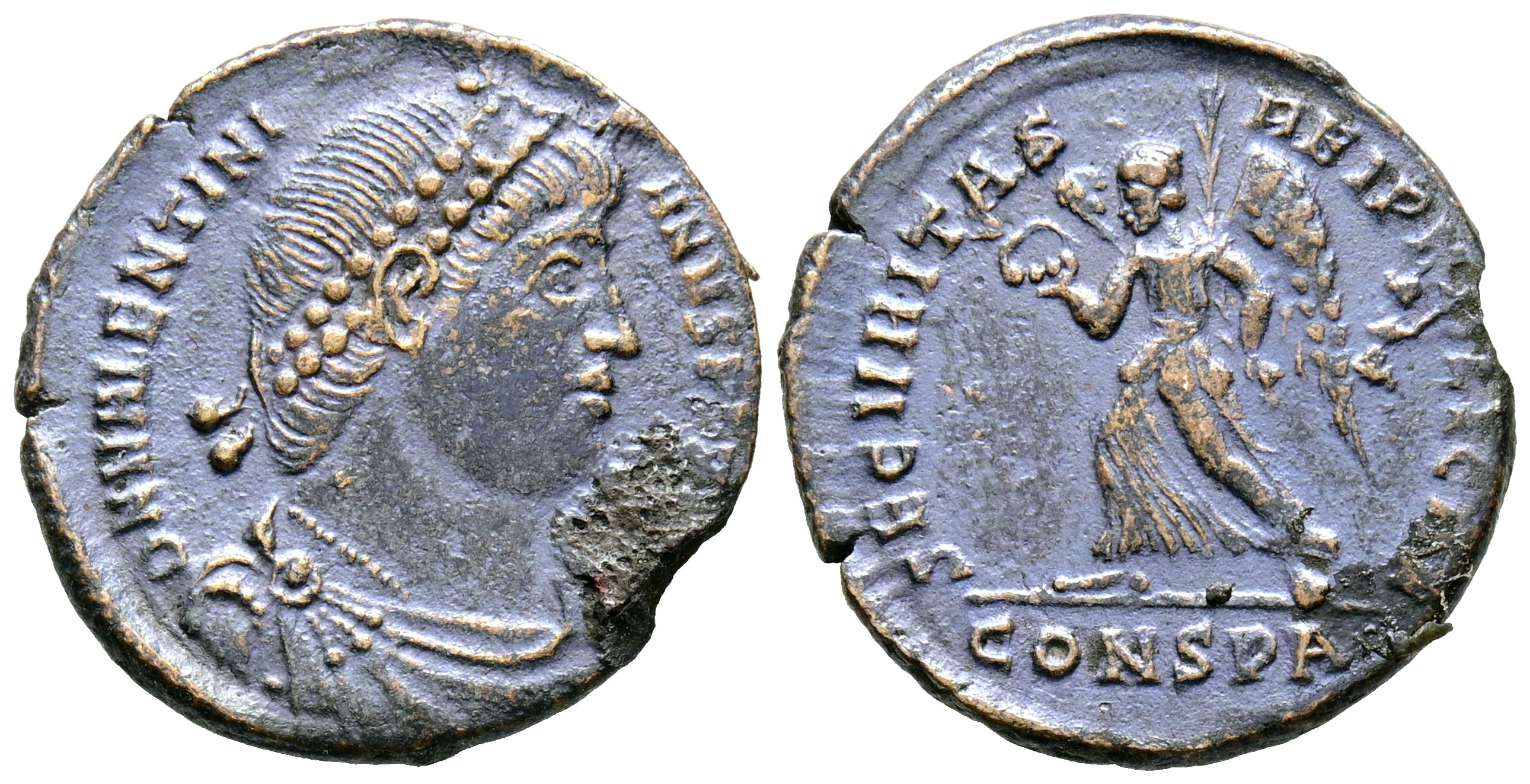 VALENTININIANO I. Follis. (Ae. 2,08g/18mm). 364-375 d.C. Constantinopla. (RIC 21a). Anv: Busto diademado y con coraza de Valentiniano I a derecha, alrededor leyenda: DN VALENTININIANVS P F AVG. Rev: Victoria avanzando a izquierda portando corona de laurel, en exergo: CONSPA, alrededor leyenda: SECVRITAS REIPVBLICAE. MBC. Repatinado.