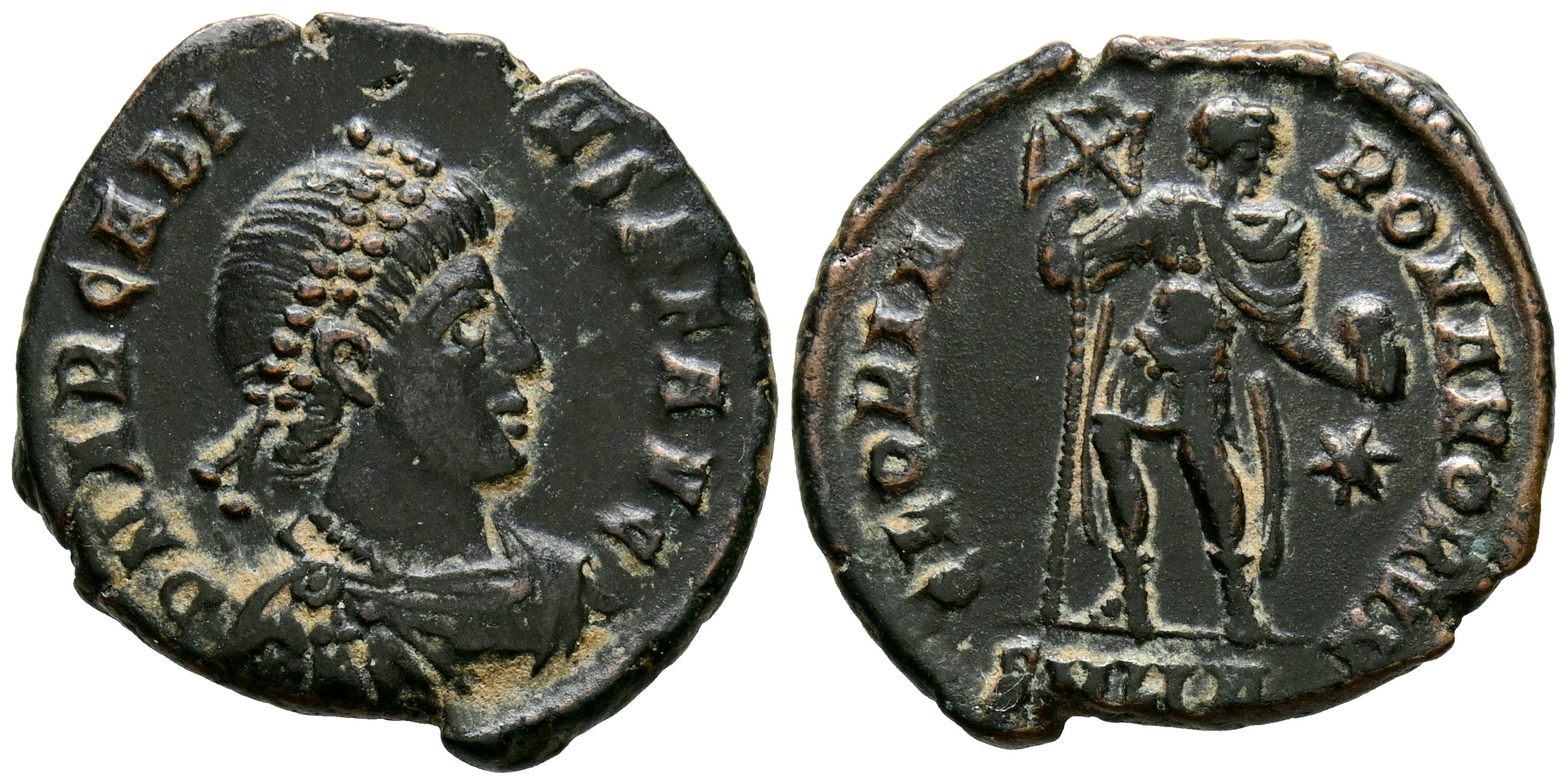 ARCADIO. Follis. (Ae. 4,55g/22mm). 392-395 d.C. Heraclea. (RIC 27B) Anv: Busto diademado y drapeado de Arcadio a derecha, alrededor leyenda: D N ARCADIVS P F AVG. Rev: Arcadio estante a derecha portando lábaro y globo, estella en capo a derecha, en exergo: SMNA, alrededor leyenda: GLORIA ROMANORVM. MBC.