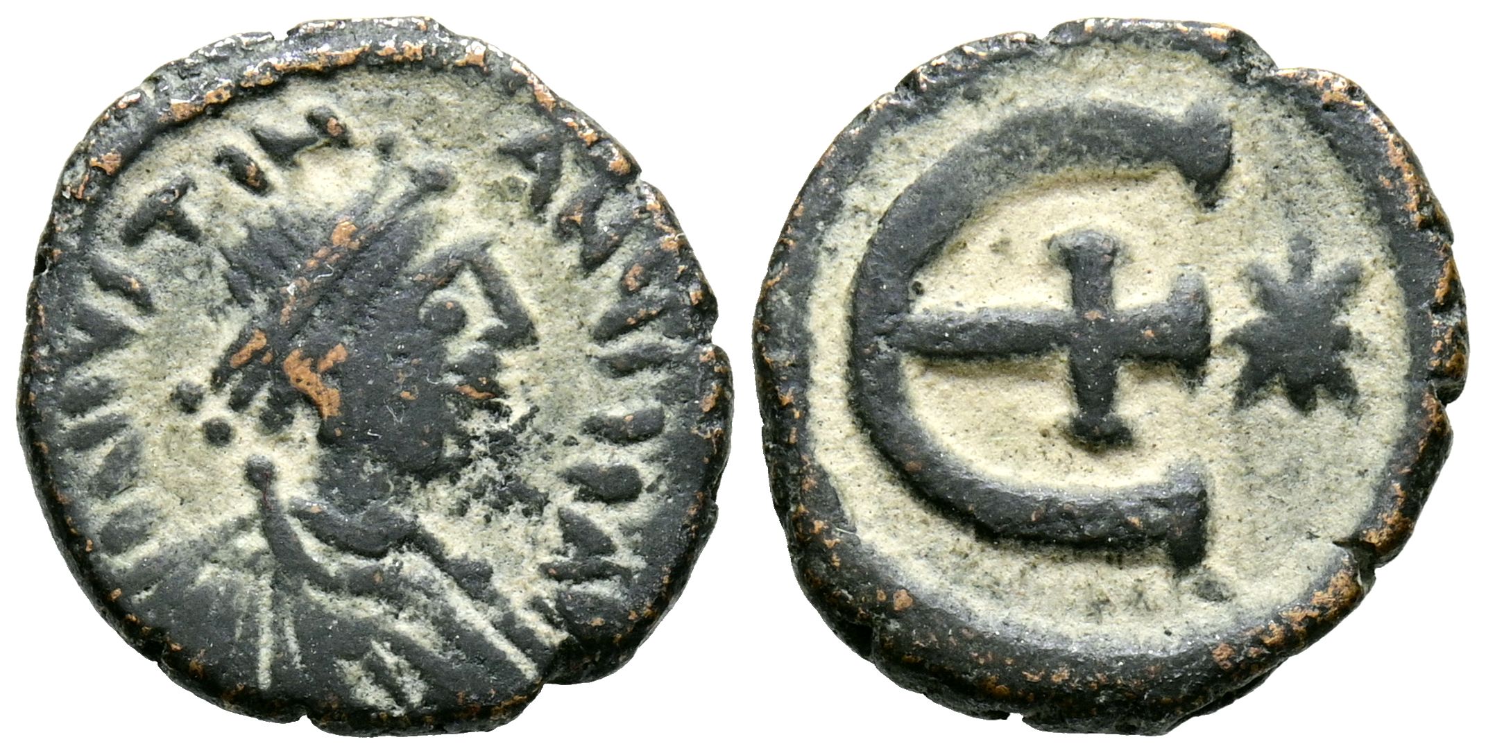 JUSTINIANO I. Pentanummium. (Ae. 2,45g/17mm). 537-551 d.C. Antioquía. (Seaby 241). Anv: Busto diademado y drapeado de Justiniano I a derecha, alrededor leyenda. Rev: E grande con cruz en el centro, a la derecha letra A. MBC.