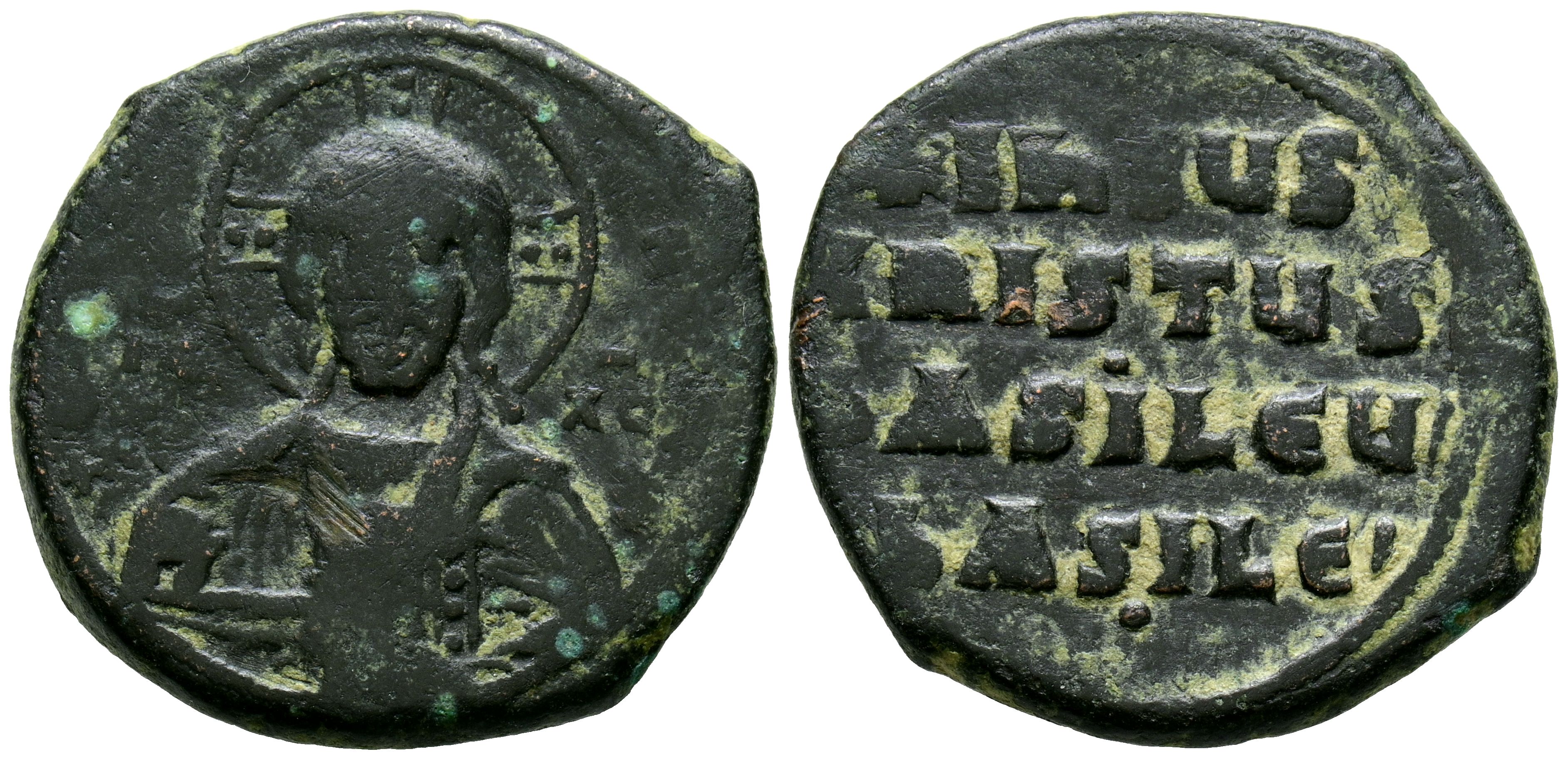 ANONIMO, tiempos de Basilio II y Constantino VIII. Follis. (Ae. 11,13g/26mm). 976-1025 d.C. Constantinopla. (Seaby 1813). Anv: Busto de Cristo de frente sosteniendo Evangelio, a los lados IC-XC. Rev: Leyenda en cuatro líneas. MBC-.